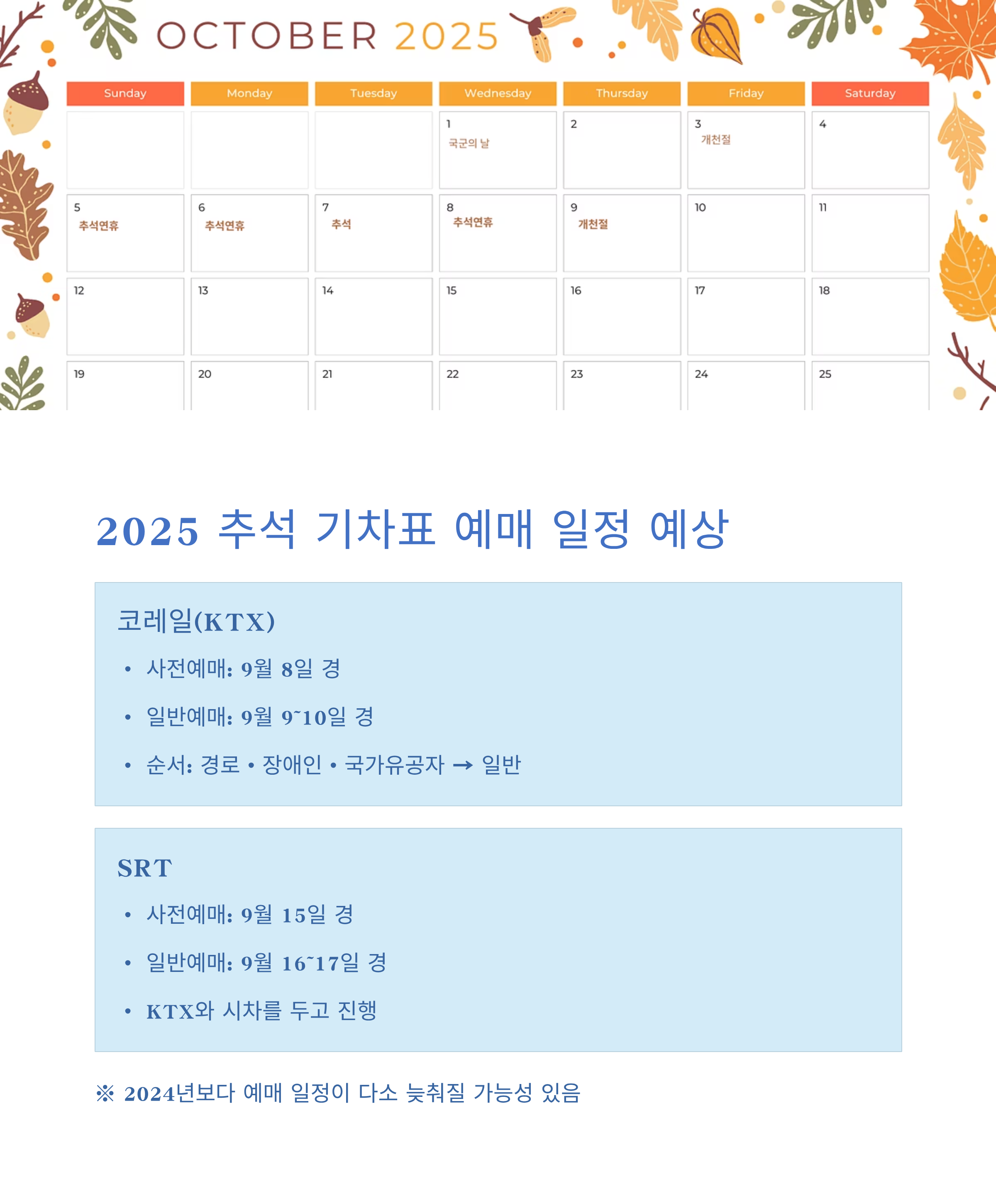 2024년과 비교하면 2025년은 예매 일정이 다소 늦춰질 가능성이 있습니다. 코레일은 9월 8일 전후, SRT는 9월 15일 전후로 예매가 시작될 것으로 예상됩니다.