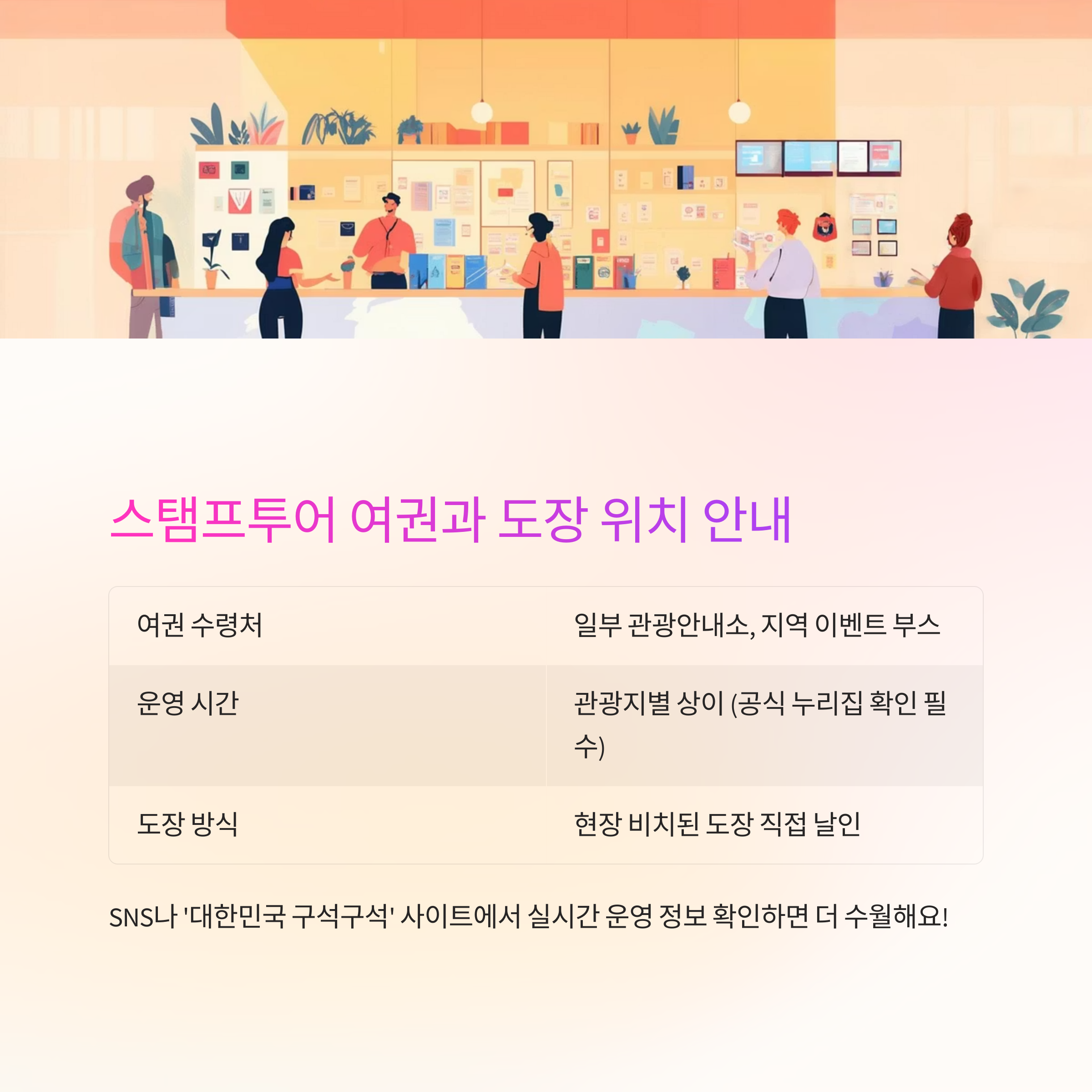 중요: 현장마다 도장을 찍는 위치와 운영 시간이 다를 수 있으므로 사전 확인은 필수입니다.