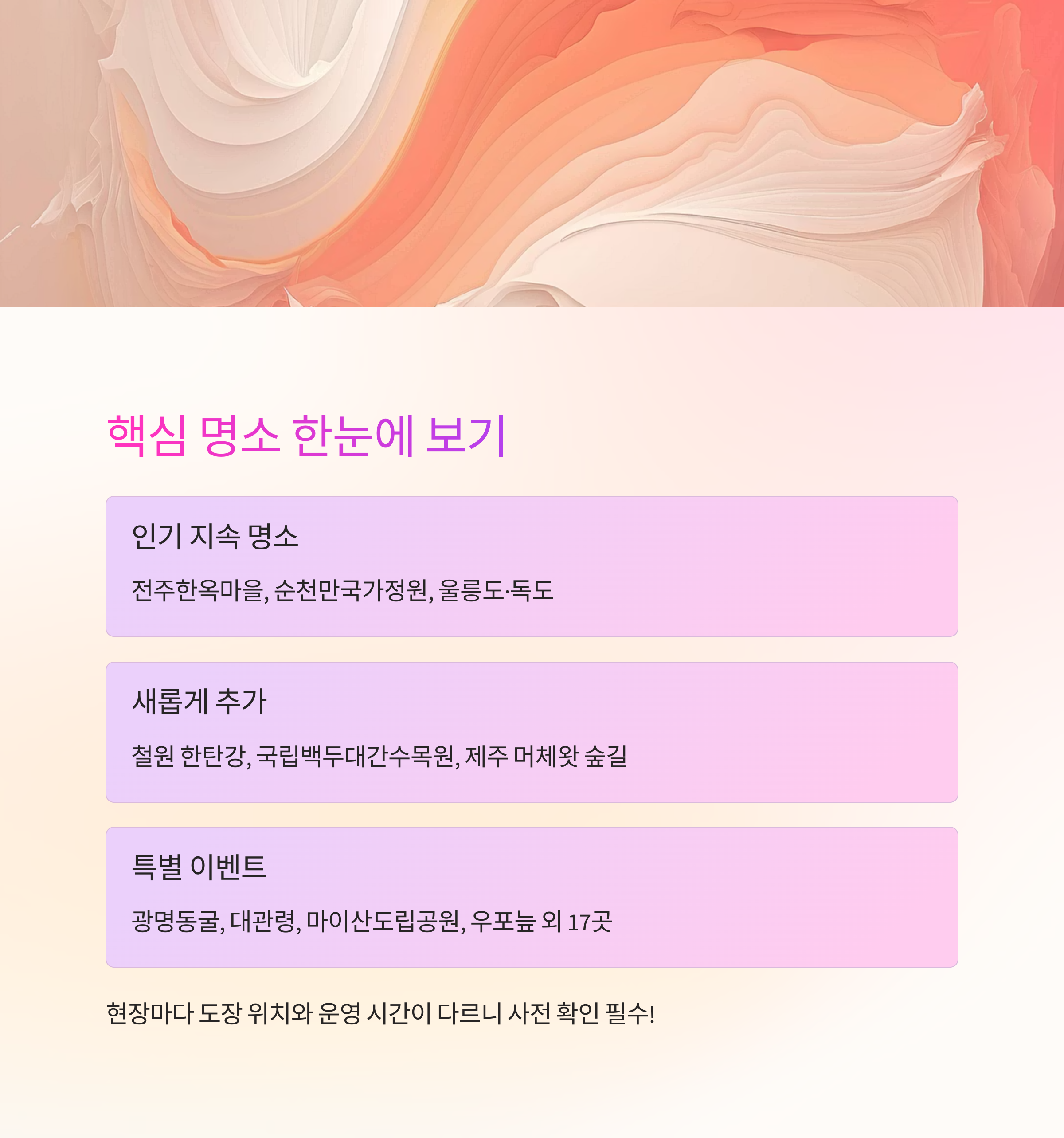 기존의 인기 명소는 물론, 새롭게 주목받는 지역 명소까지 다양하게 포함되어 있습니다.