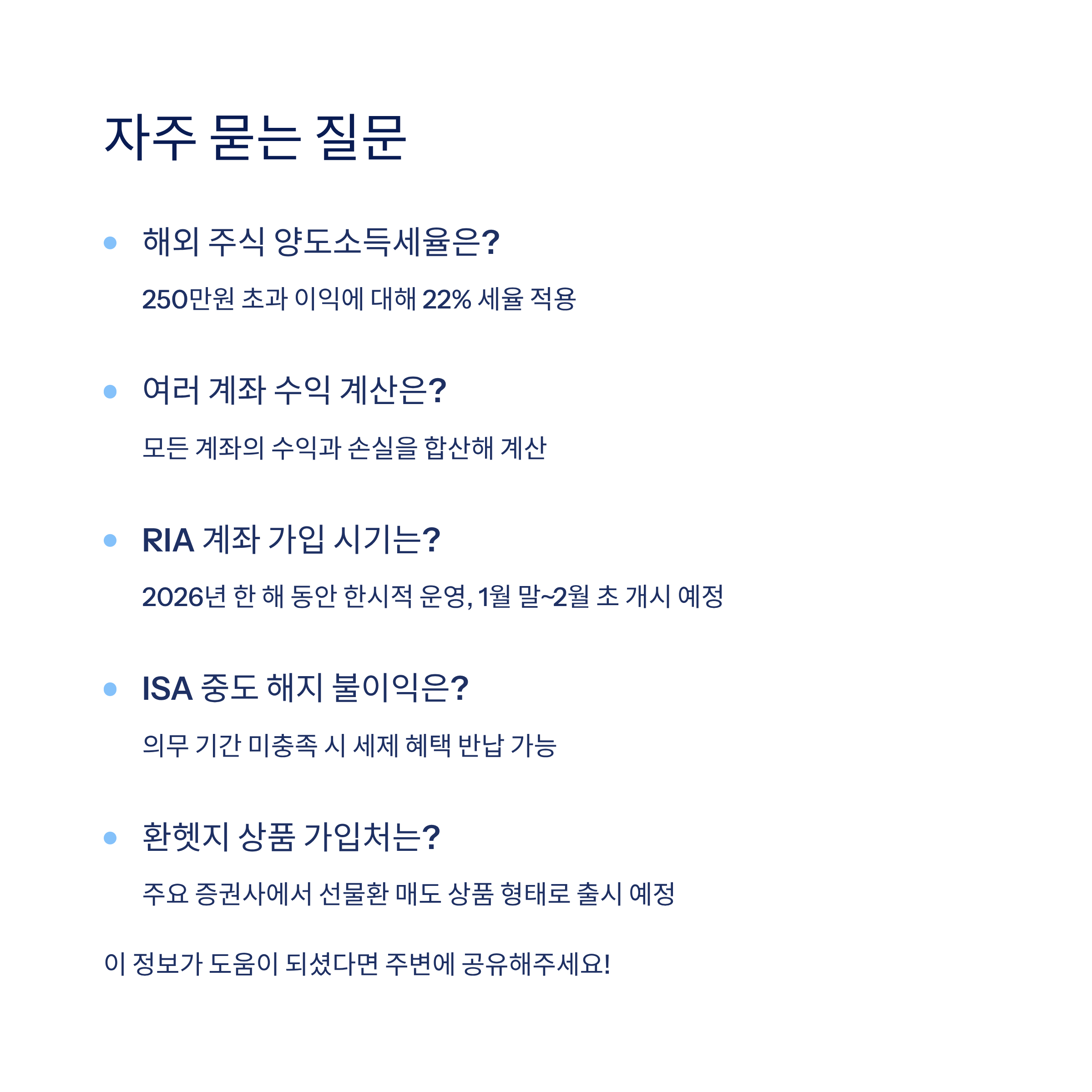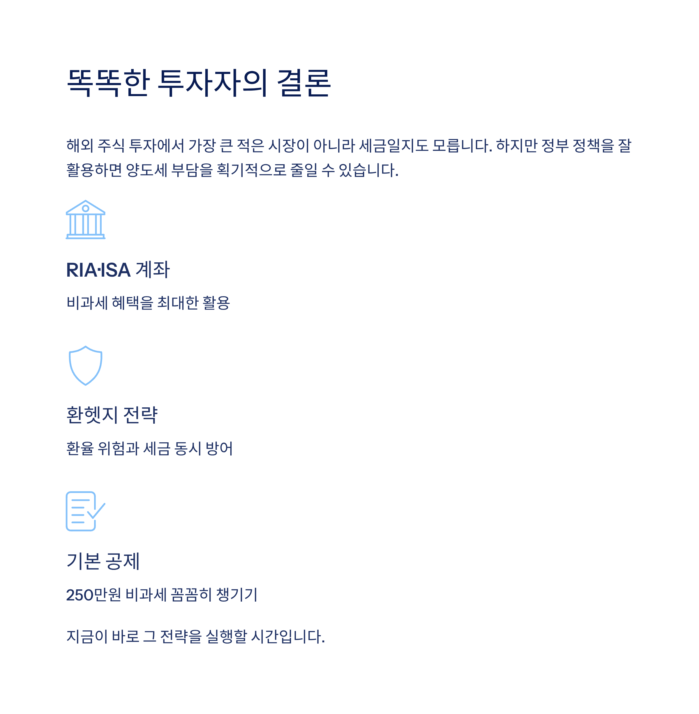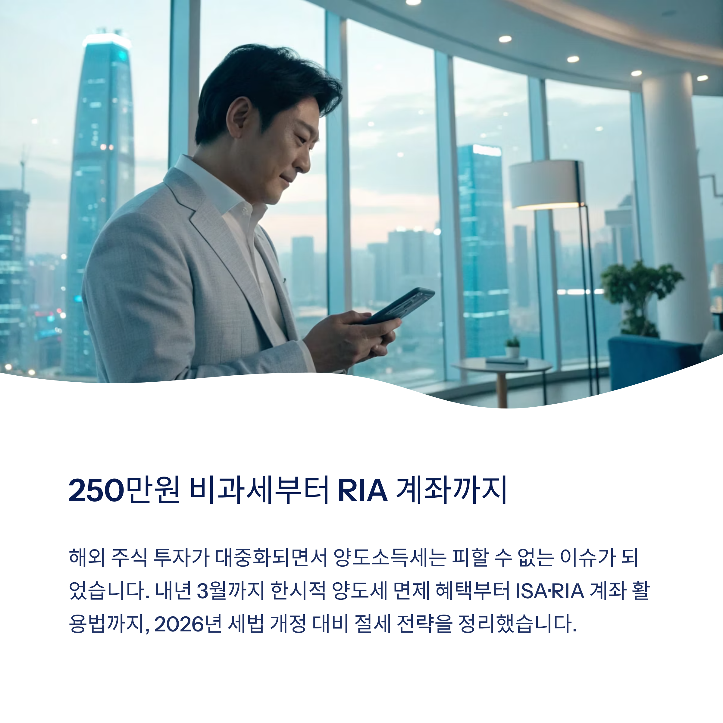 해외 주식 투자가 점점 대중화되면서 '세금'은 더 이상 피할 수 없는 이슈가 되었습니다. 특히 양도소득세는 직접 신고하고 납부해야 하기 때문에 미리 알고 준비하는 것이 필수인데요. 내년 3월까지 한시적으로 제공되는 양도세 면제 혜택부터, ISA 계좌와 RIA 계좌 활용법까지! 이 글에서는 2026년 세법 개정에 대비해 투자 수익을 지키기 위한 절세 전략을 쉽게 정리해 드립니다.