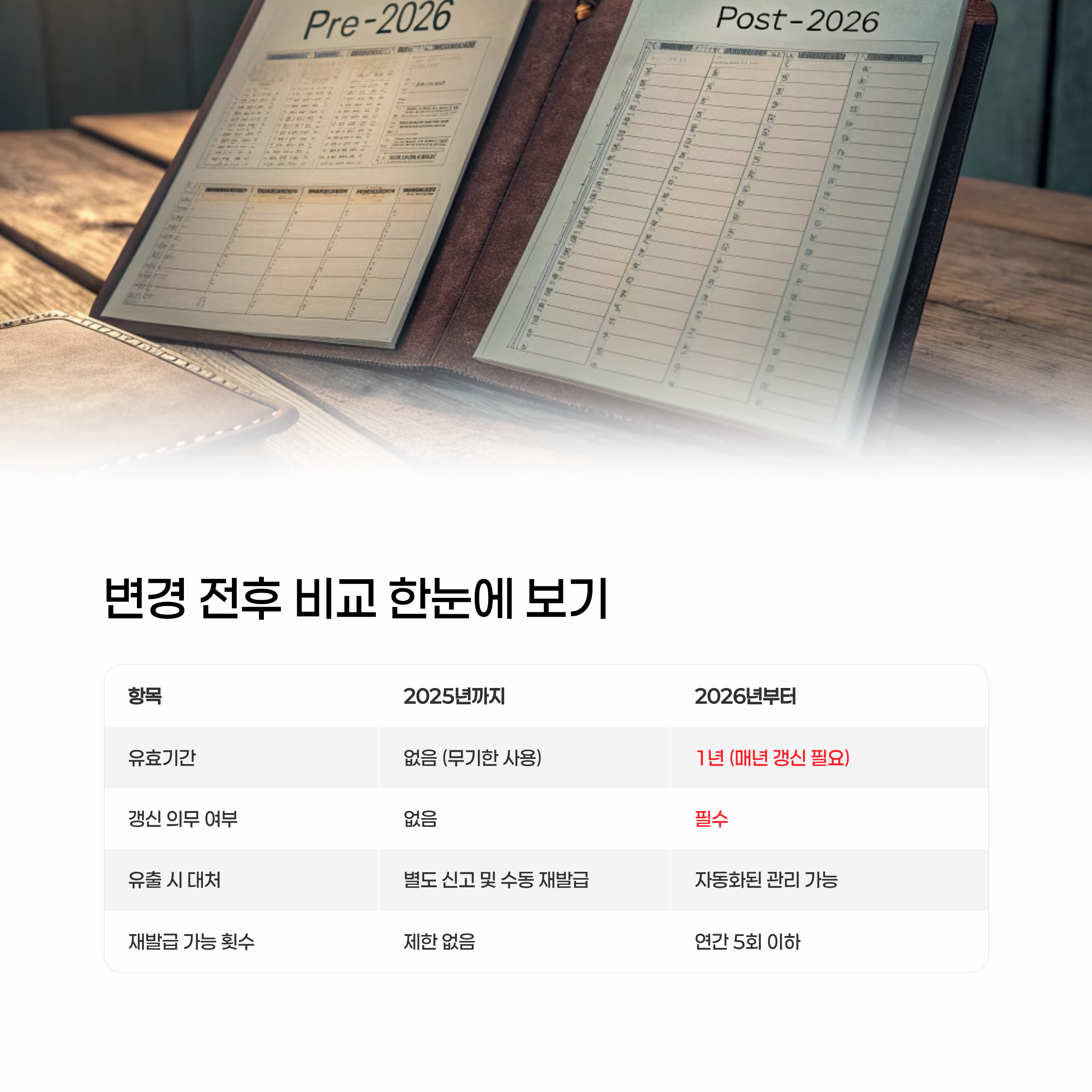 | 유효기간 | 없음 (무기한 사용) | 1년 (매년 갱신 필요) |