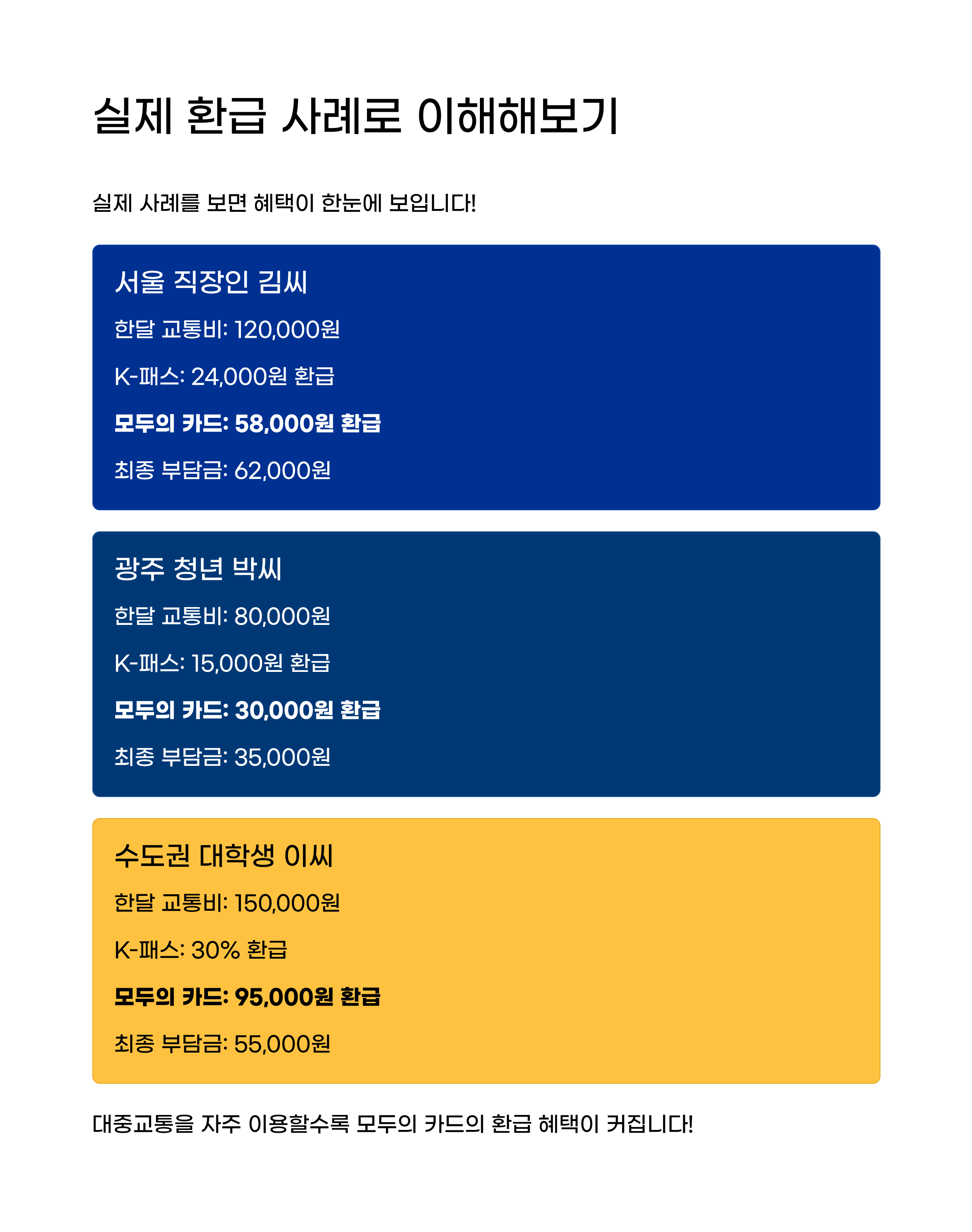 | 이용자 유형 | 한달 교통비 | K-패스 환급 | 모두의 카드 환급 | 최종 부담금 |
