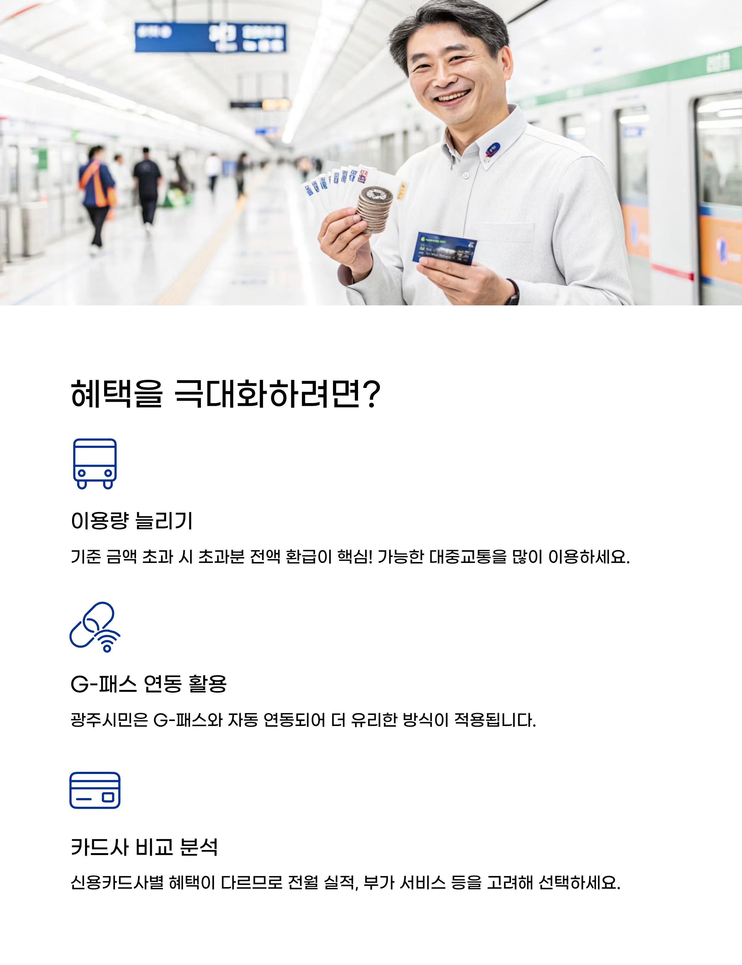 환급 기준 금액 초과 시, 초과분 전액 환급이 핵심이므로 가능한 대중교통을 많이 이용하세요. - 광주 G-패스와 연동 활용