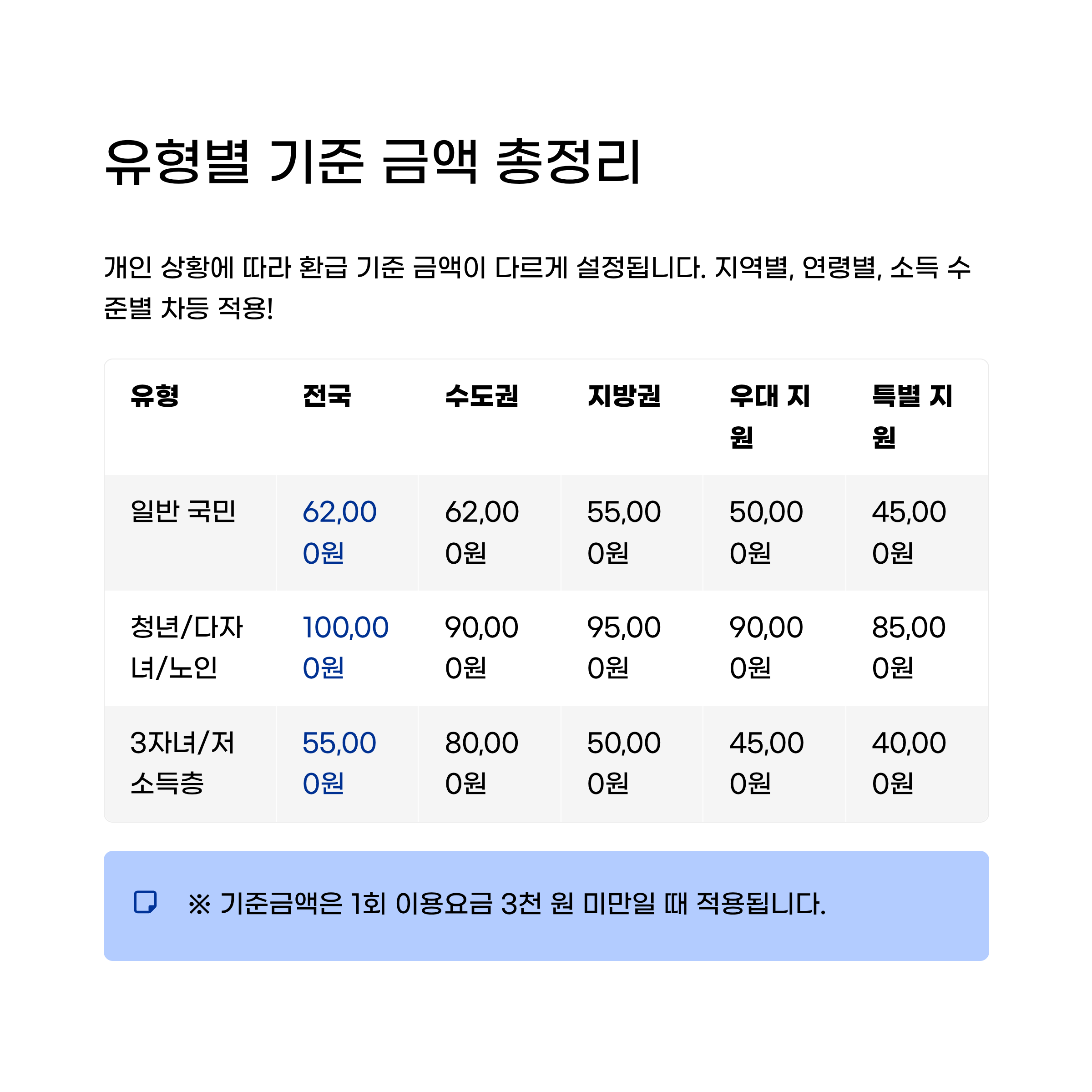 모두의 카드는 개인 상황에 따라 환급 기준 금액이 다르게 설정됩니다. 특히 지역별, 연령별, 소득 수준별 차등 적용이 돋보입니다.
