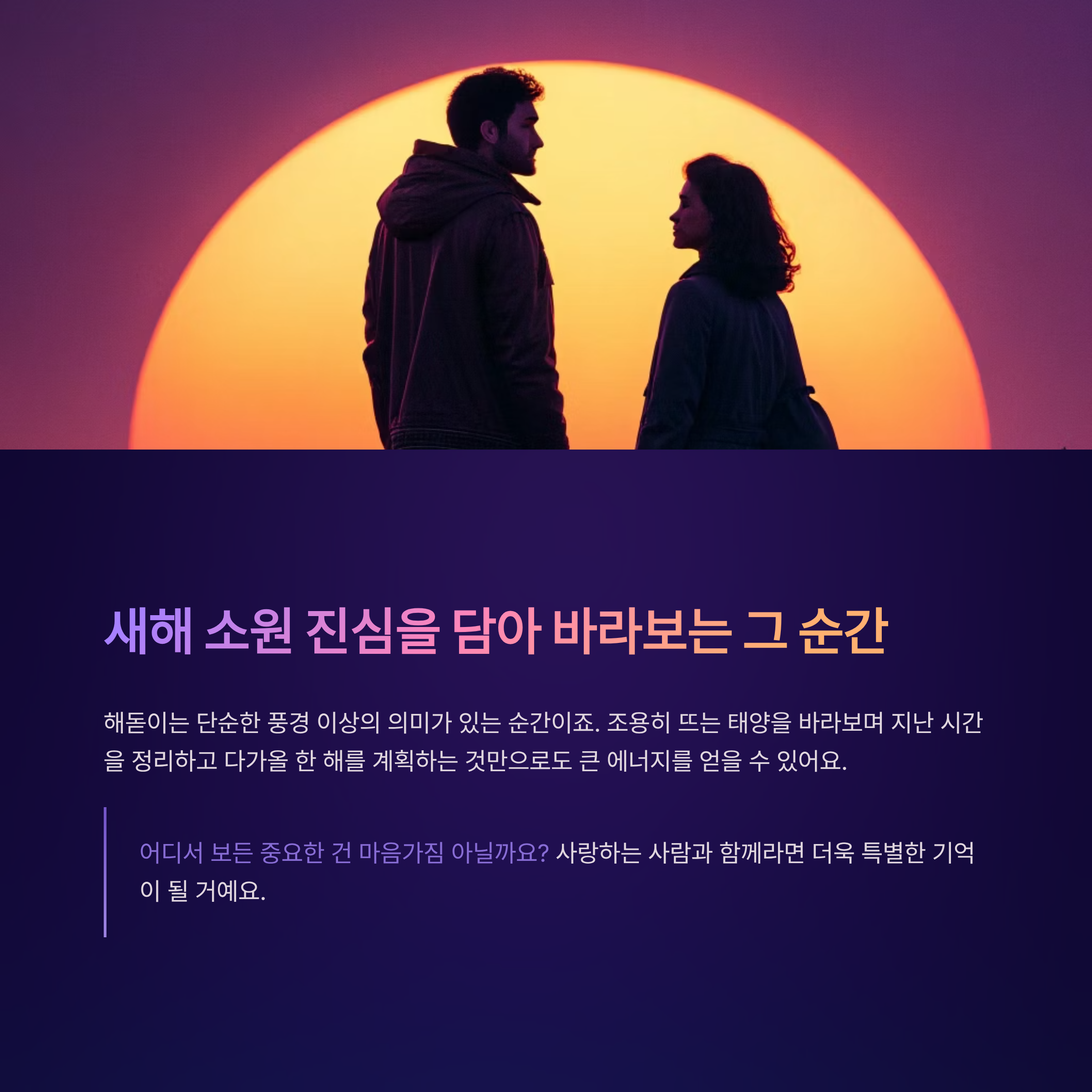 조용히 뜨는 태양을 바라보며 지난 시간을 정리하고 다가올 한 해를 계획하는 것만으로도 큰 에너지를 얻을 수 있어요.