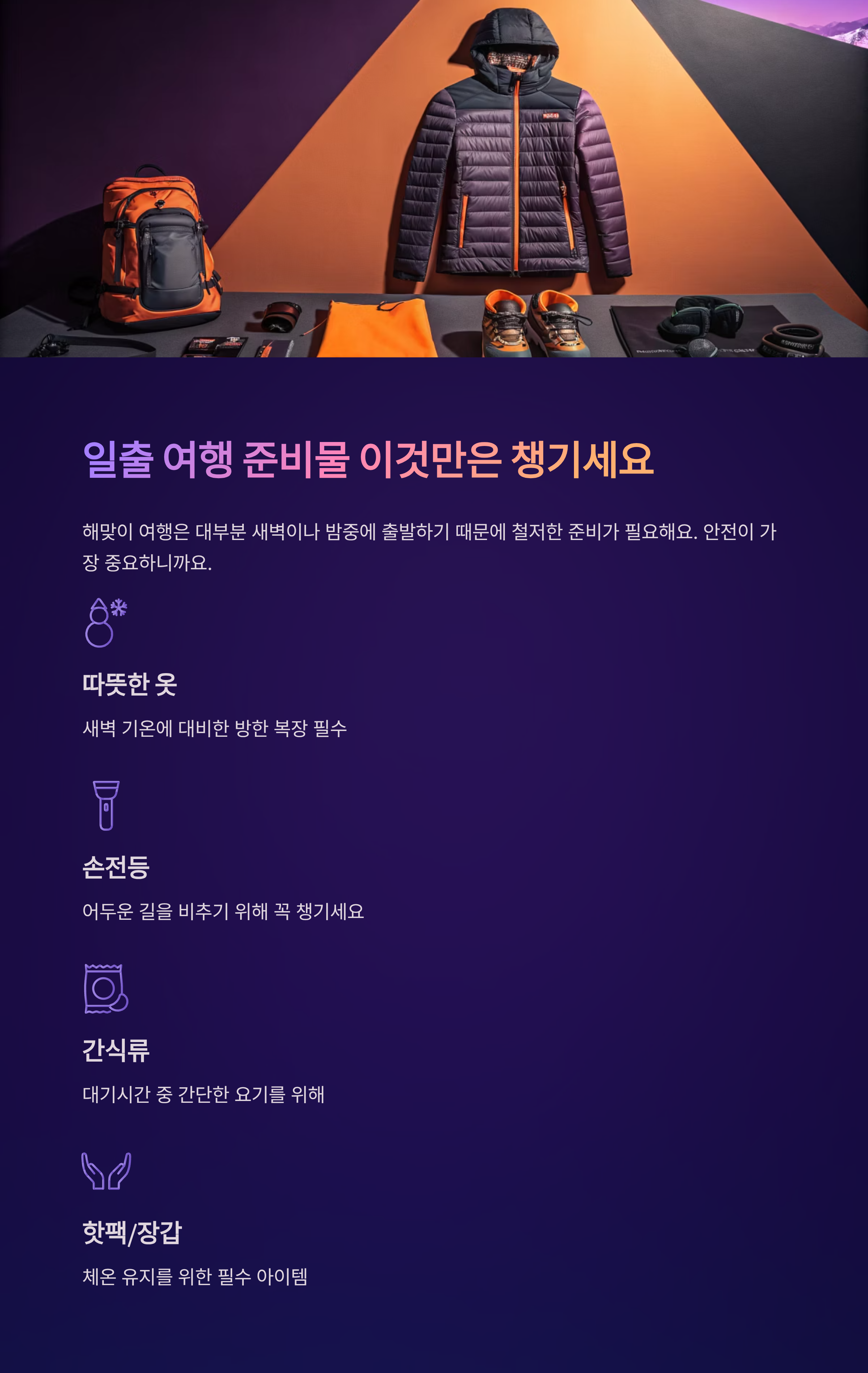 해맞이 여행은 대부분 새벽이나 밤중에 출발하기 때문에 철저한 준비가 필요해요. 따뜻한 복장은 물론, 등산 시에는 아이젠, 손전등, 장갑, 핫팩도 필수예요.