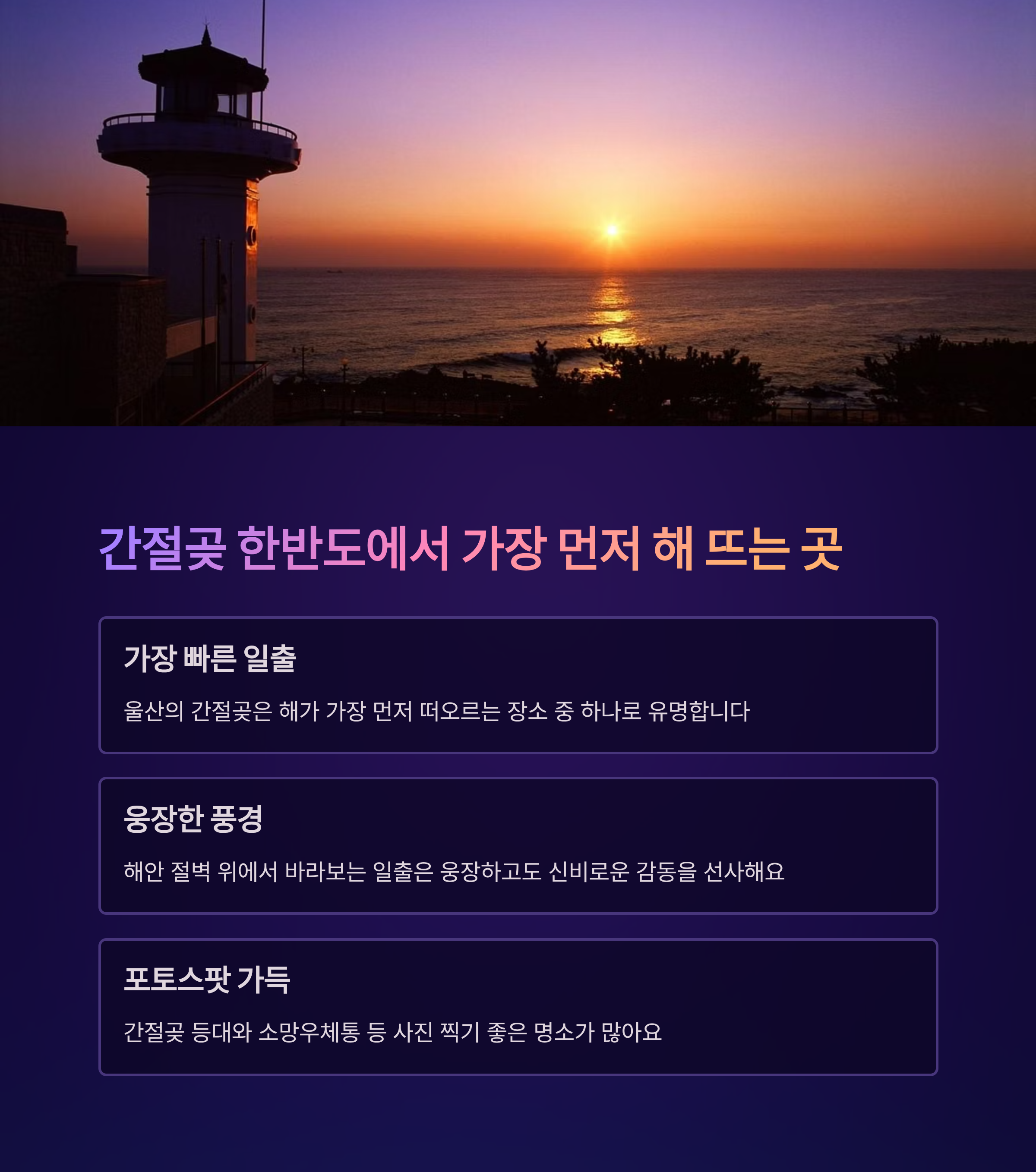 울산의 간절곶은 해가 가장 먼저 떠오르는 장소 중 하나로 잘 알려져 있어요. 해안 절벽 위에서 바라보는 일출은 웅장하고도 신비롭습니다.
