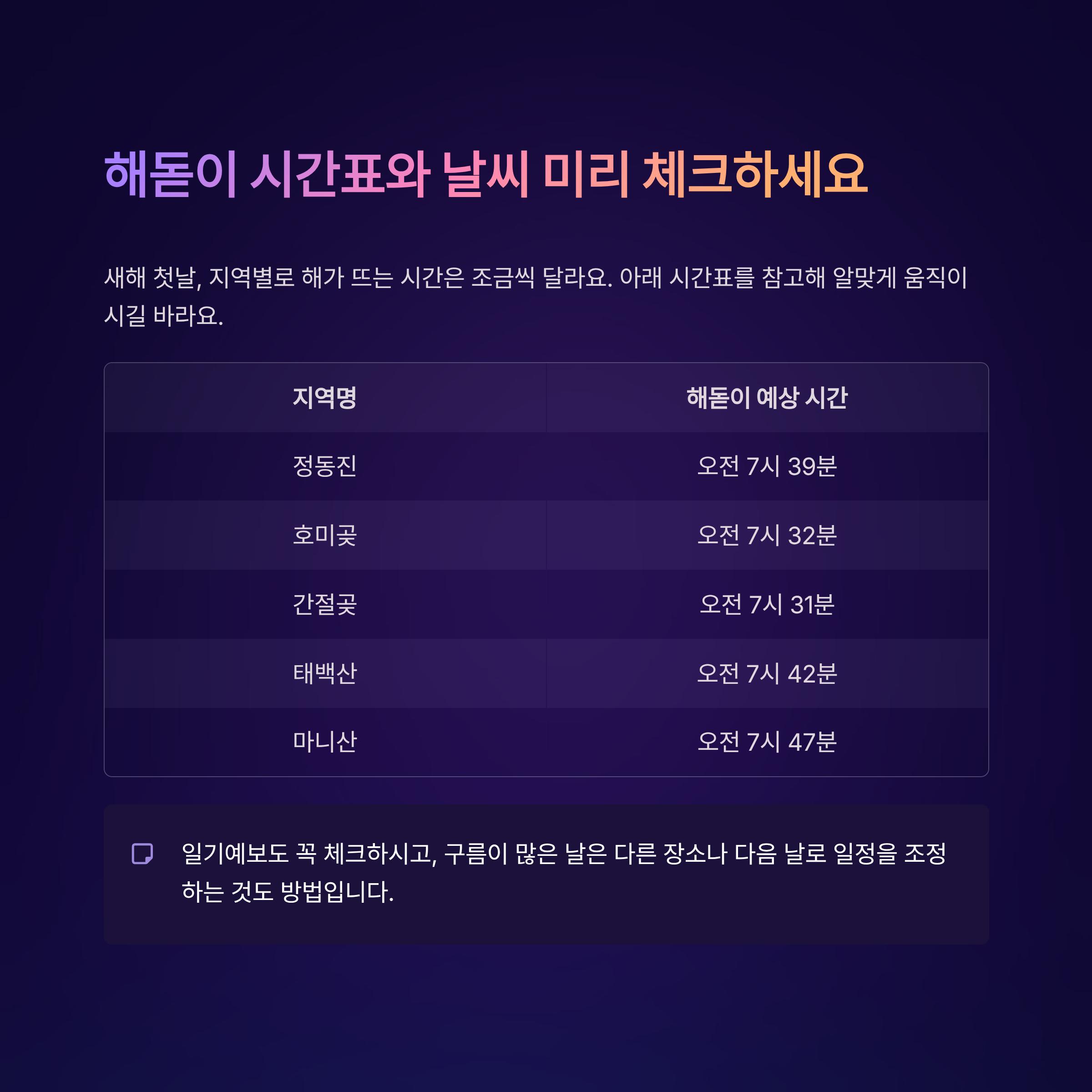 해돋이 시간표와 날씨 미리 체크하세요