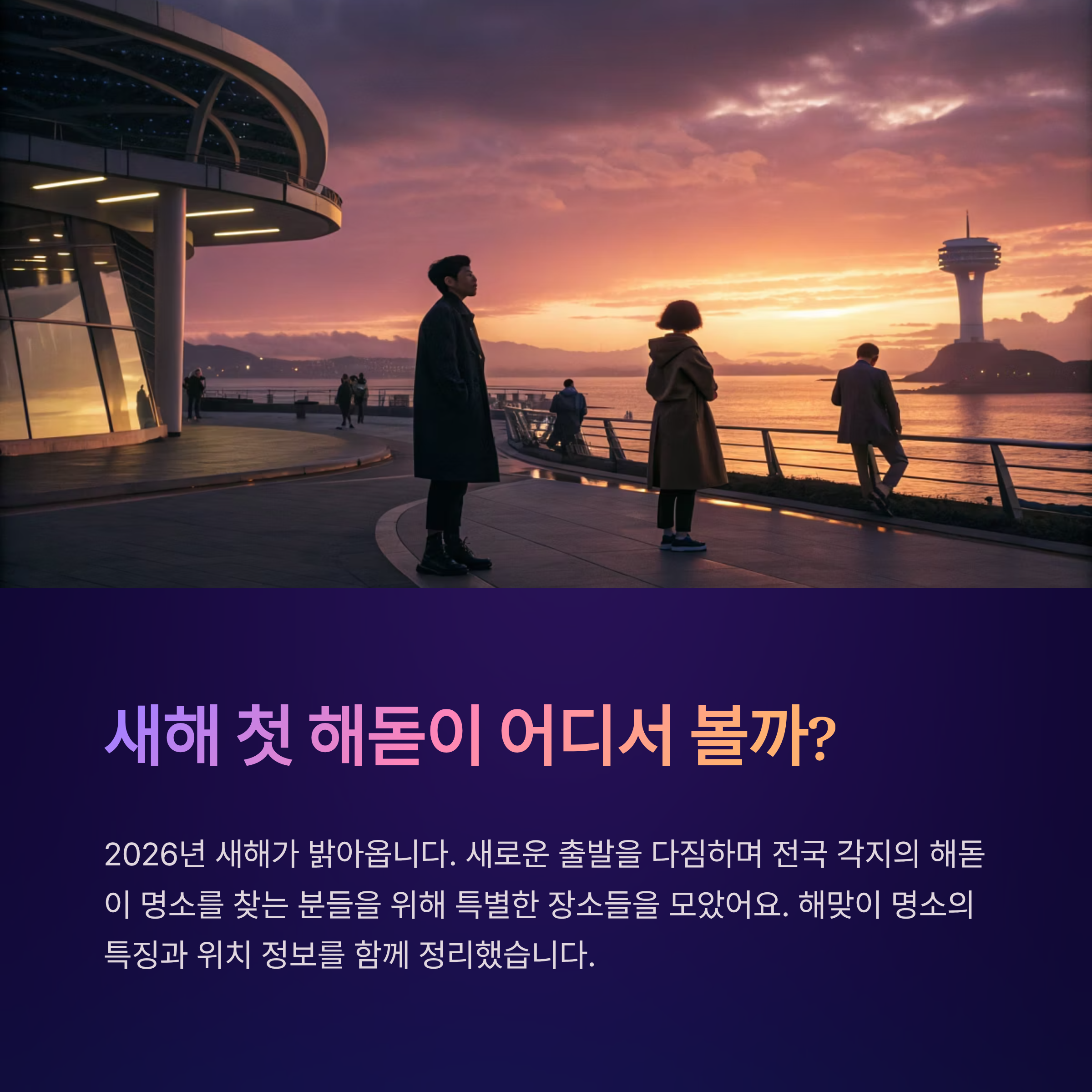 2026년 새해가 밝아옵니다. 새로운 출발을 다짐하며 많은 분들이 해돋이 명소를 찾고 계신데요. 전국 각지에서 떠오르는 첫 해를 바라보며 소원을 빌기 좋은 장소들을 모아 소개해 드릴게요. 해맞이 명소의 특징과 위치 정보까지 함께 정리했으니, 올 겨울 여행 계획에 참고하시길 바랍니다.