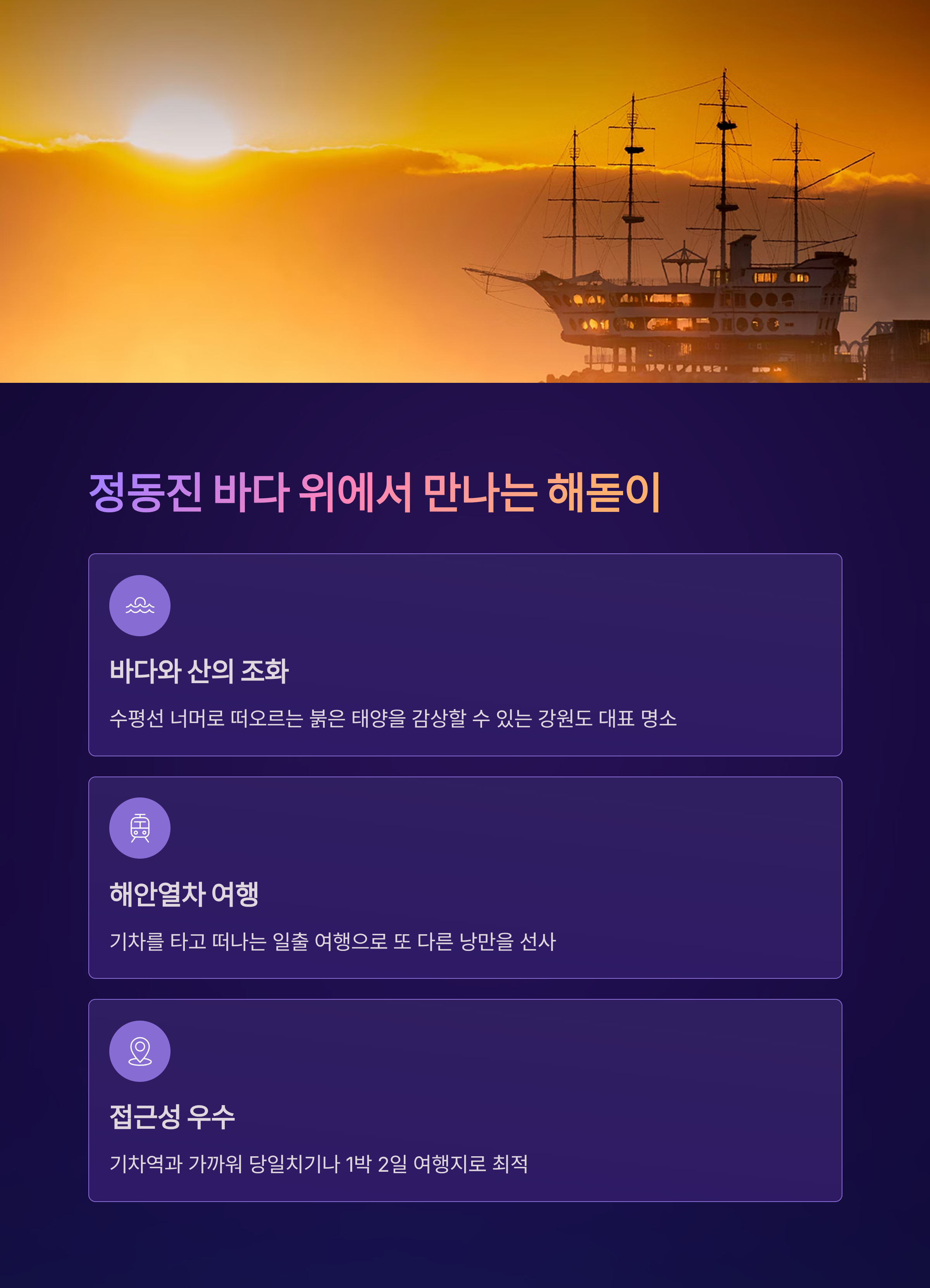 강원도 정동진은 매년 해돋이 시즌마다 인파가 몰리는 대표적인 명소예요. 바다와 산이 함께 어우러져 수평선 너머로 떠오르는 붉은 태양을 볼 수 있는데, 특히 해안열차를 타고 떠나는 일출 여행은 또 다른 낭만을 선사하죠.