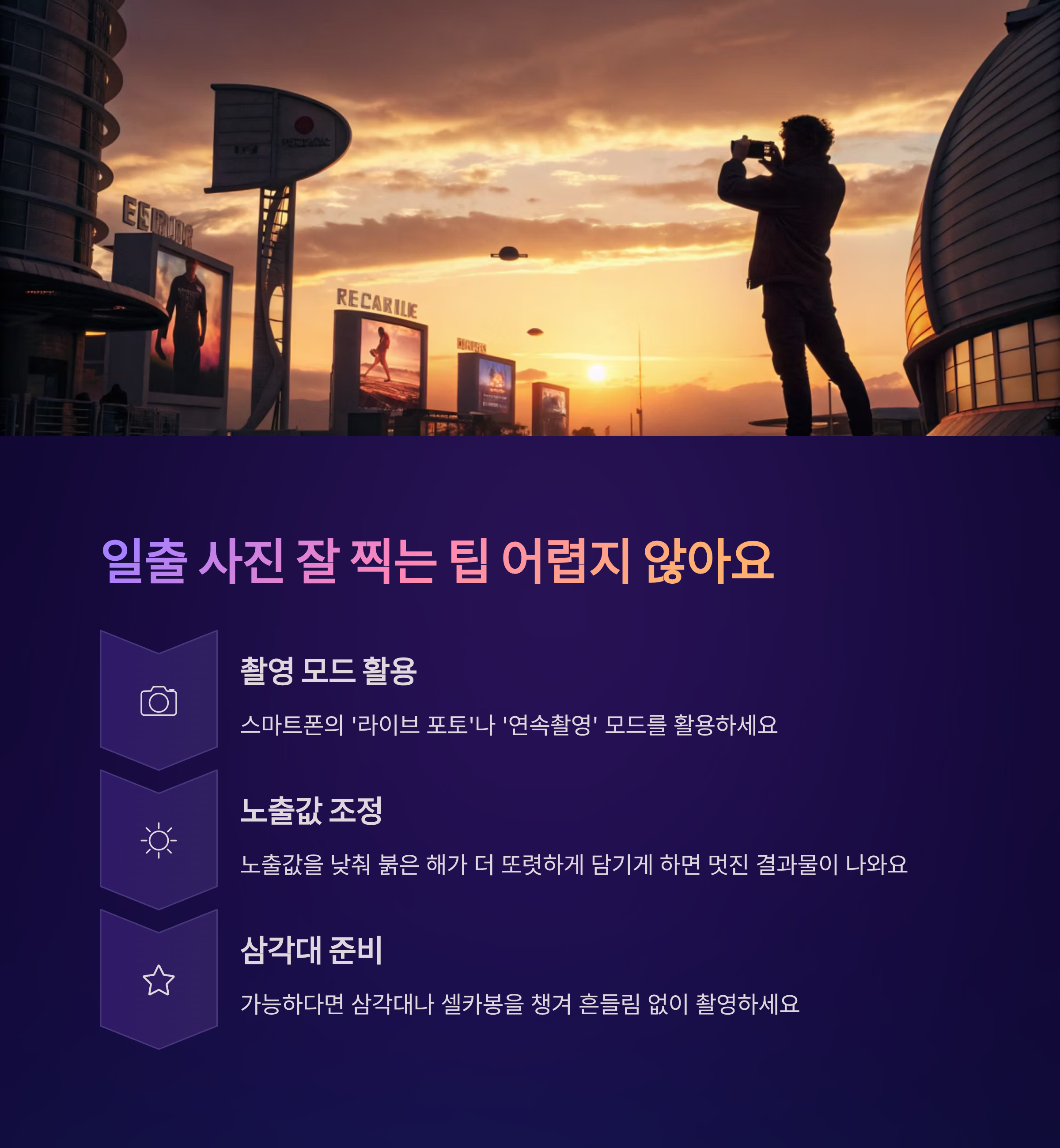 스마트폰은 ‘라이브 포토’나 ‘연속촬영’ 모드를 활용하면 좋고, 노출값을 낮춰 붉은 해가 더 또렷하게 담기게 하면 멋진 결과물이 나옵니다.