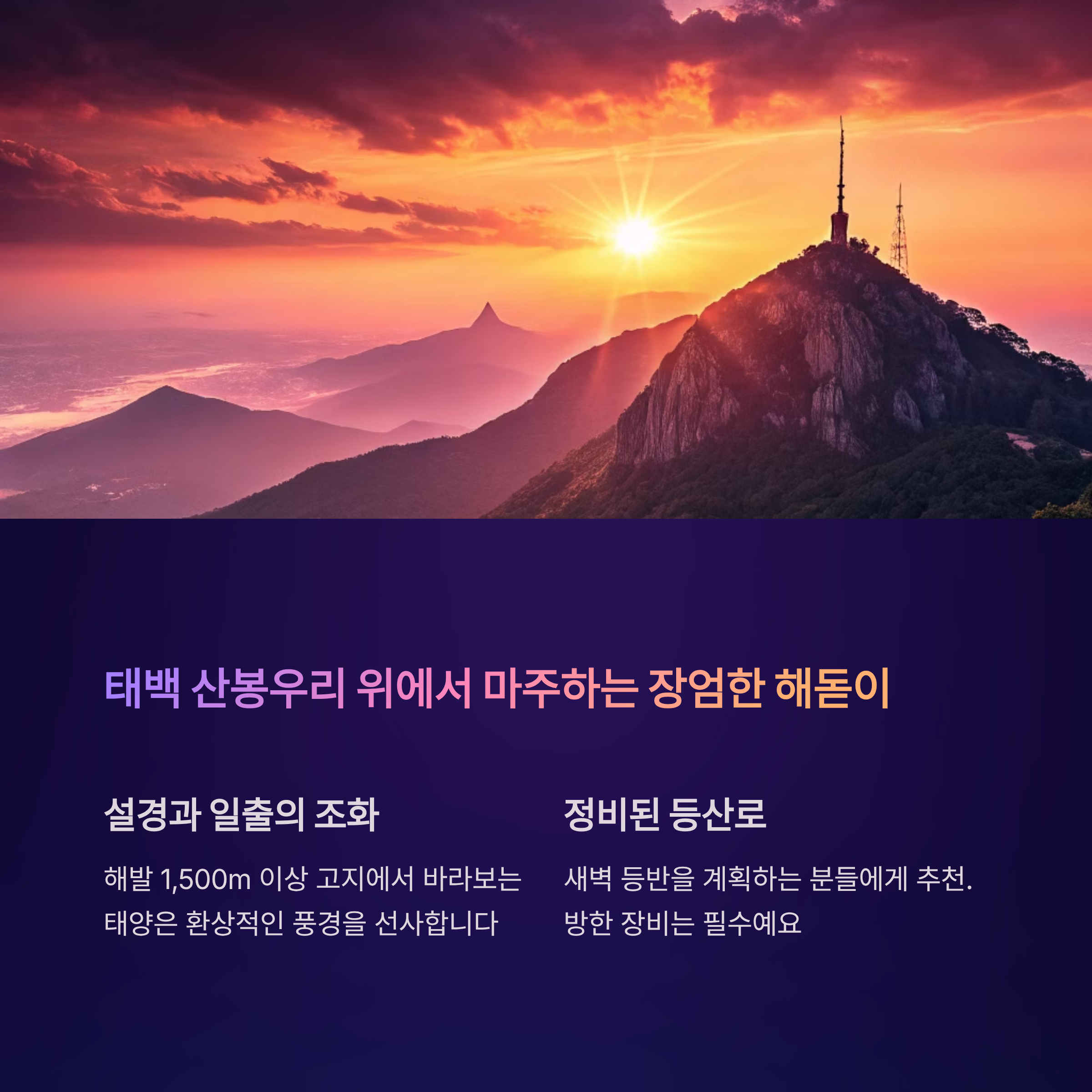 등산로가 잘 정비되어 있어 새벽 등반을 계획하는 분들에게 추천드려요. 다만, 방한 장비는 필수입니다.