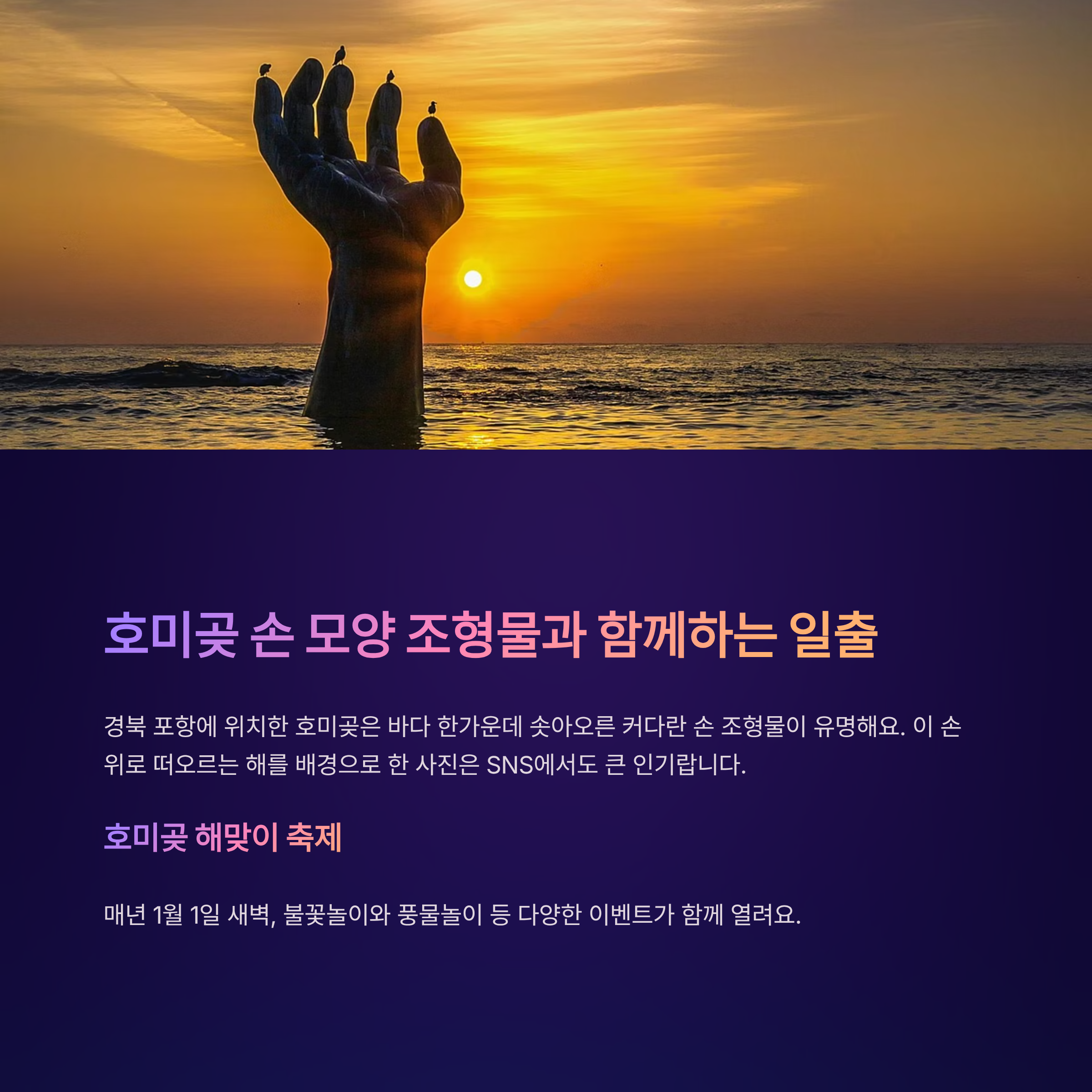경북 포항에 위치한 호미곶은 바다 한가운데 솟아오른 커다란 손 조형물이 유명하죠. 이 손 위로 떠오르는 해를 배경으로 한 사진은 SNS에서도 큰 인기예요.