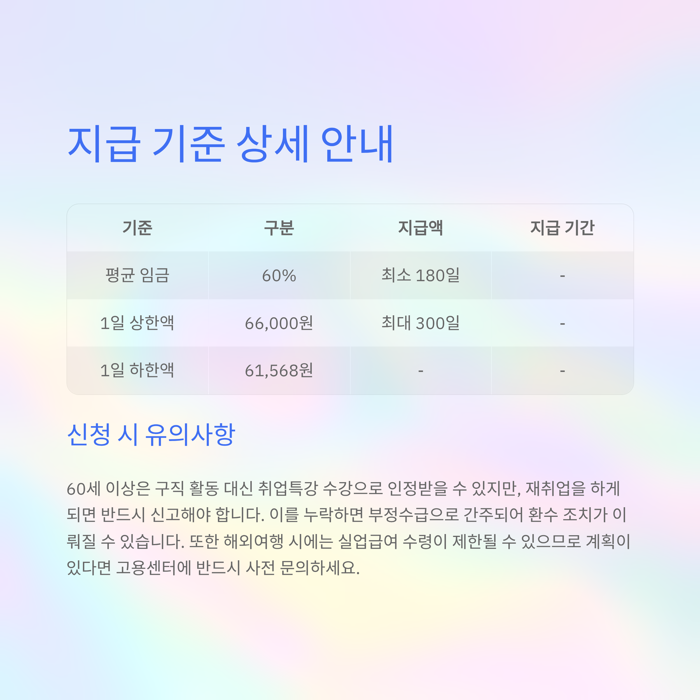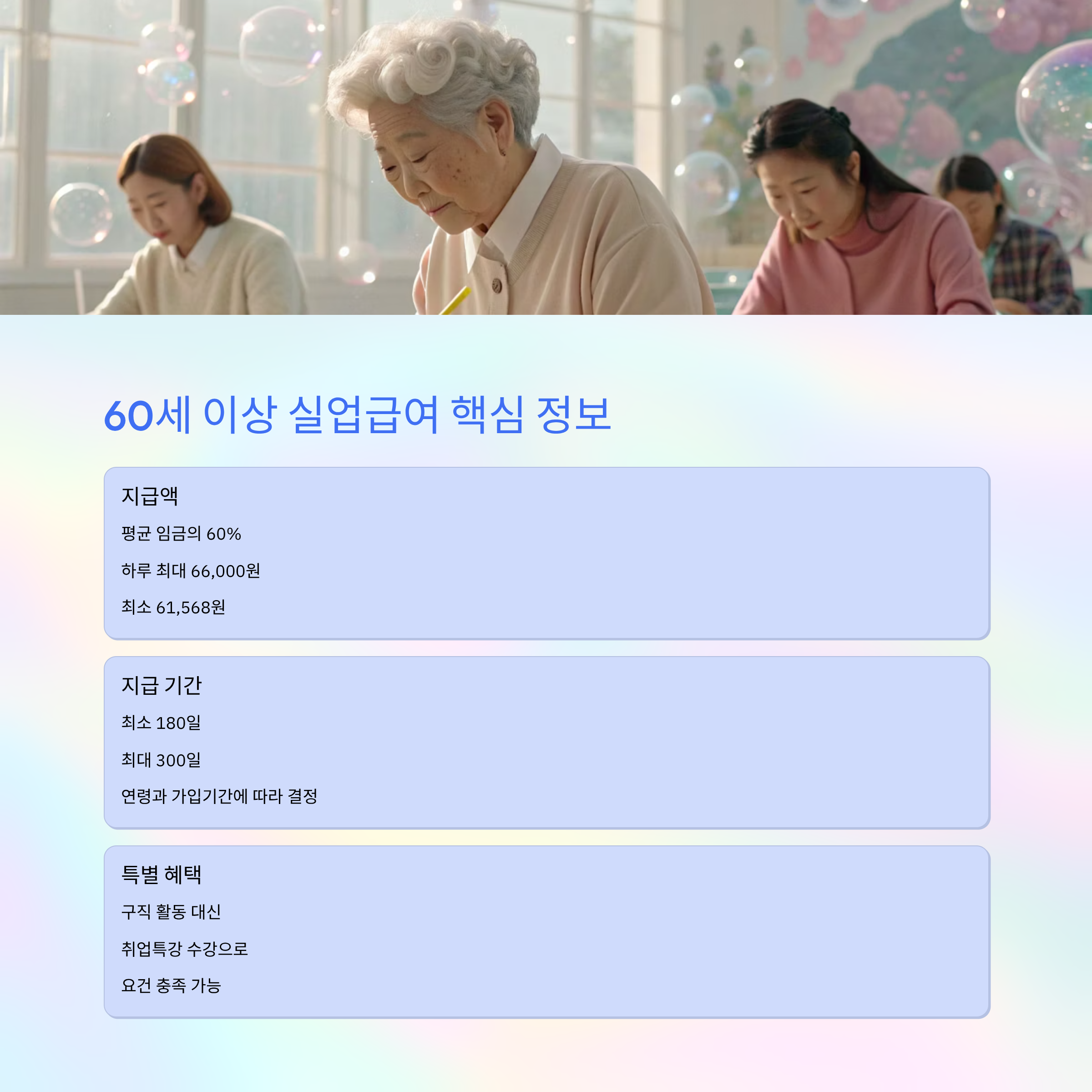 60세 이상 실업급여는 평균 임금의 60%를 지급하며, 하루 최대 66,000원, 최소 61,568원으로 책정됩니다. 지급 기간은 최소 180일에서 최대 300일까지이며, 연령과 고용보험 가입 기간에 따라 달라집니다. 특히 60세 이상은 구직 활동 대신 취업특강 수강으로 요건을 충족할 수 있어 활용도가 높습니다.