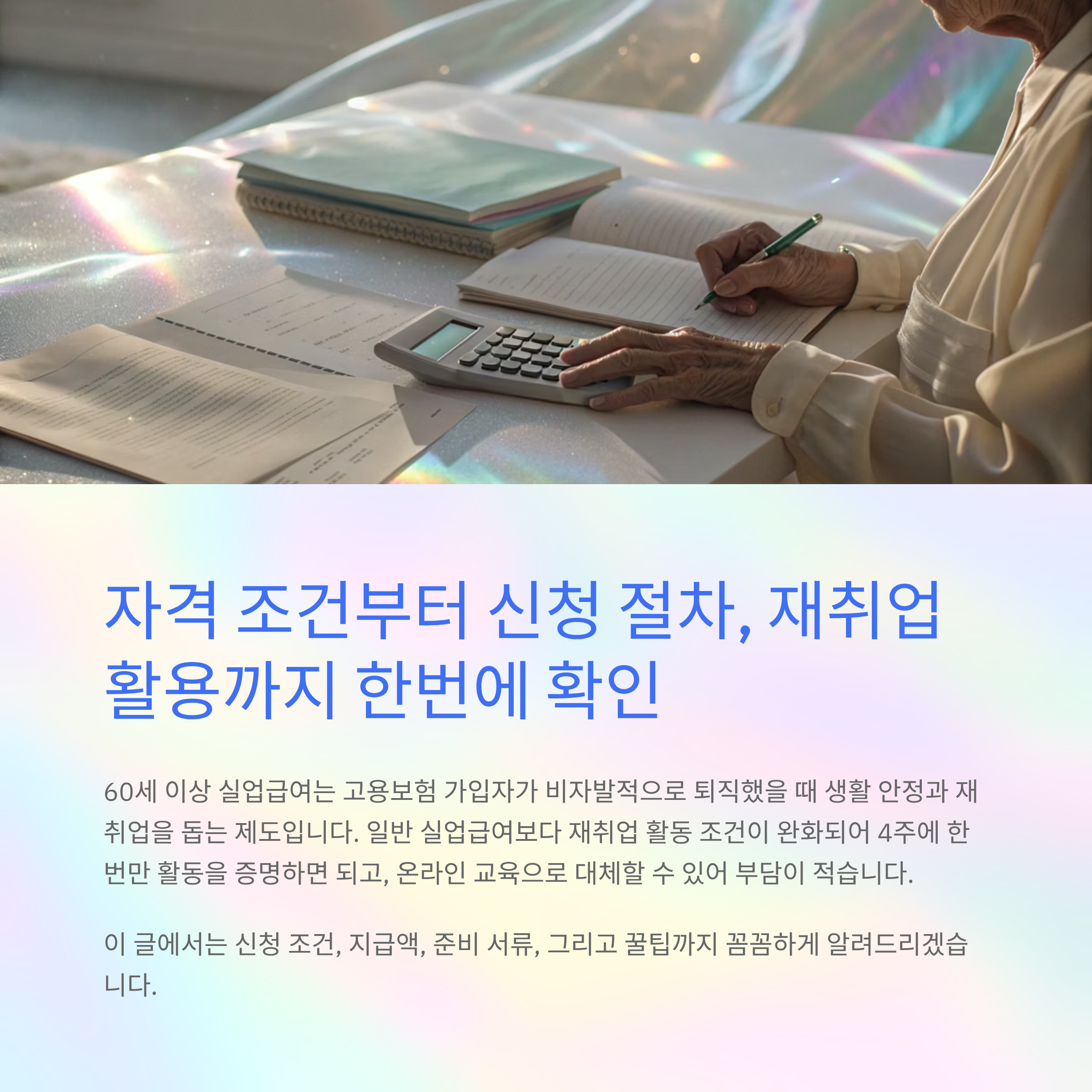 60세 이상 실업급여는 고용보험 가입자가 비자발적으로 퇴직했을 때 생활 안정과 재취업을 돕는 제도입니다. 일반 실업급여보다 재취업 활동 조건이 완화되어 4주에 한 번만 활동을 증명하면 되고, 온라인 교육으로 대체할 수 있어 부담이 적습니다. 이 글에서는 신청 조건, 지급액, 준비 서류, 그리고 꿀팁까지 꼼꼼하게 알려드리겠습니다.