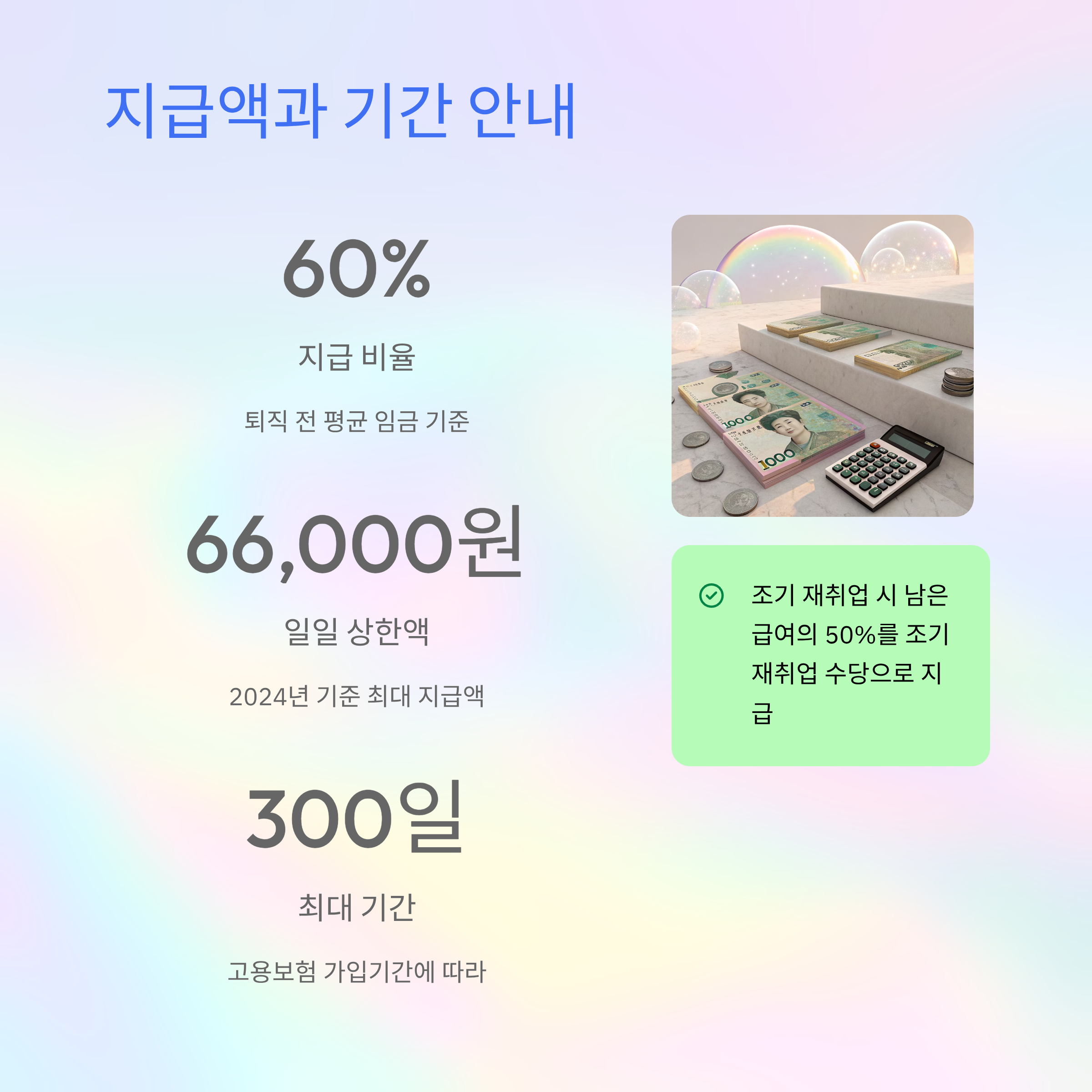 실업급여는 퇴직 전 평균 임금의 60%로 산정됩니다. 2024년 기준 하루 상한액은 66,000원, 하한액은 61,568원입니다. 지급 기간은 고용보험 가입 기간에 따라 달라지며, 최소 180일에서 최대 300일까지 가능합니다. 또한 조기 재취업에 성공하면 남은 급여의 50%를 조기 재취업 수당으로 받을 수도 있습니다.