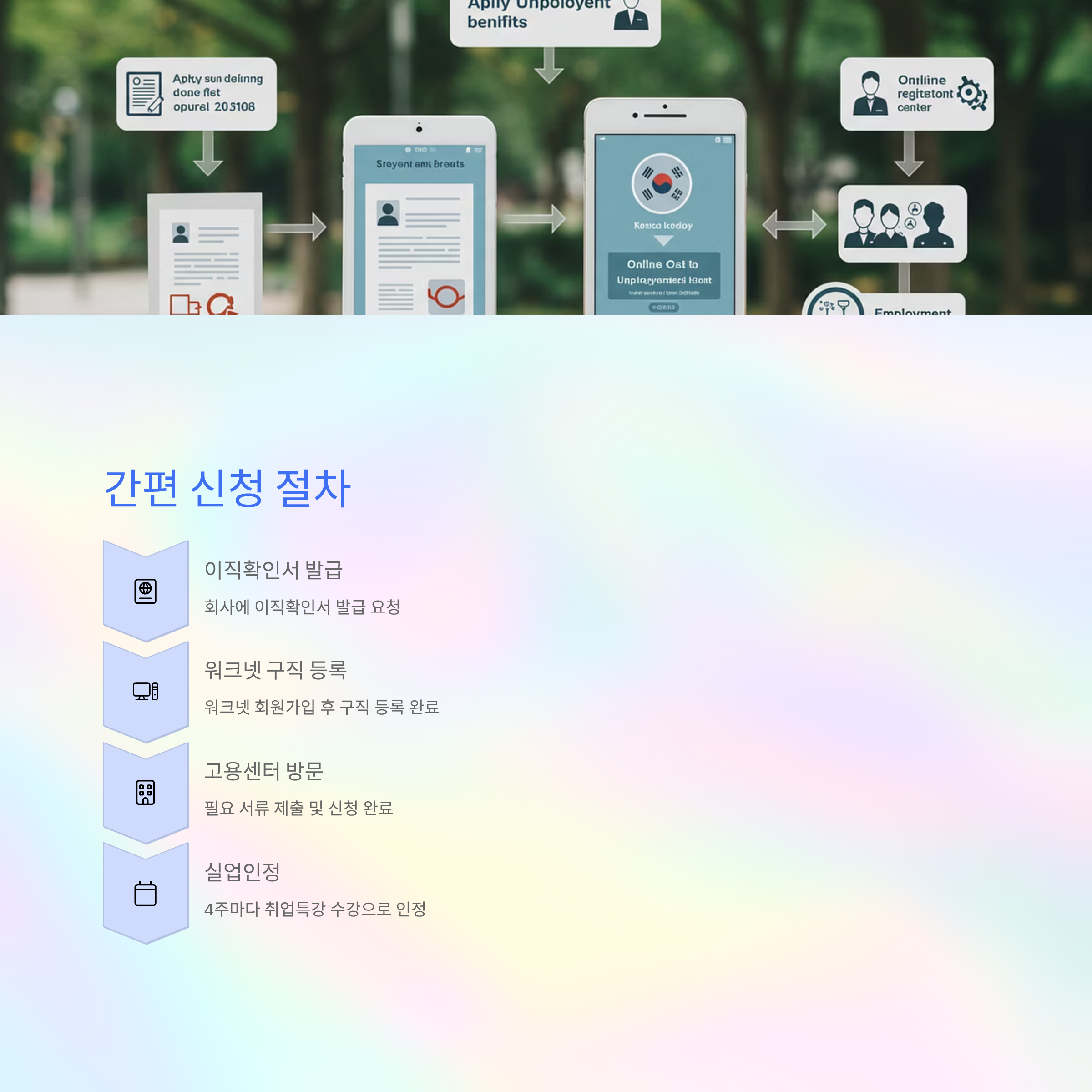 먼저 회사에 이직확인서 발급을 요청하세요. 이후 워크넷에 회원가입 후 구직 등록을 완료합니다. 다음으로 고용센터를 방문해 신분증, 통장 사본, 근로계약서 등 필요 서류를 제출하면 됩니다. 이후에는 4주에 한 번씩 실업인정을 받으며, 이때 취업특강 수강으로 구직활동을 대체할 수 있습니다.
