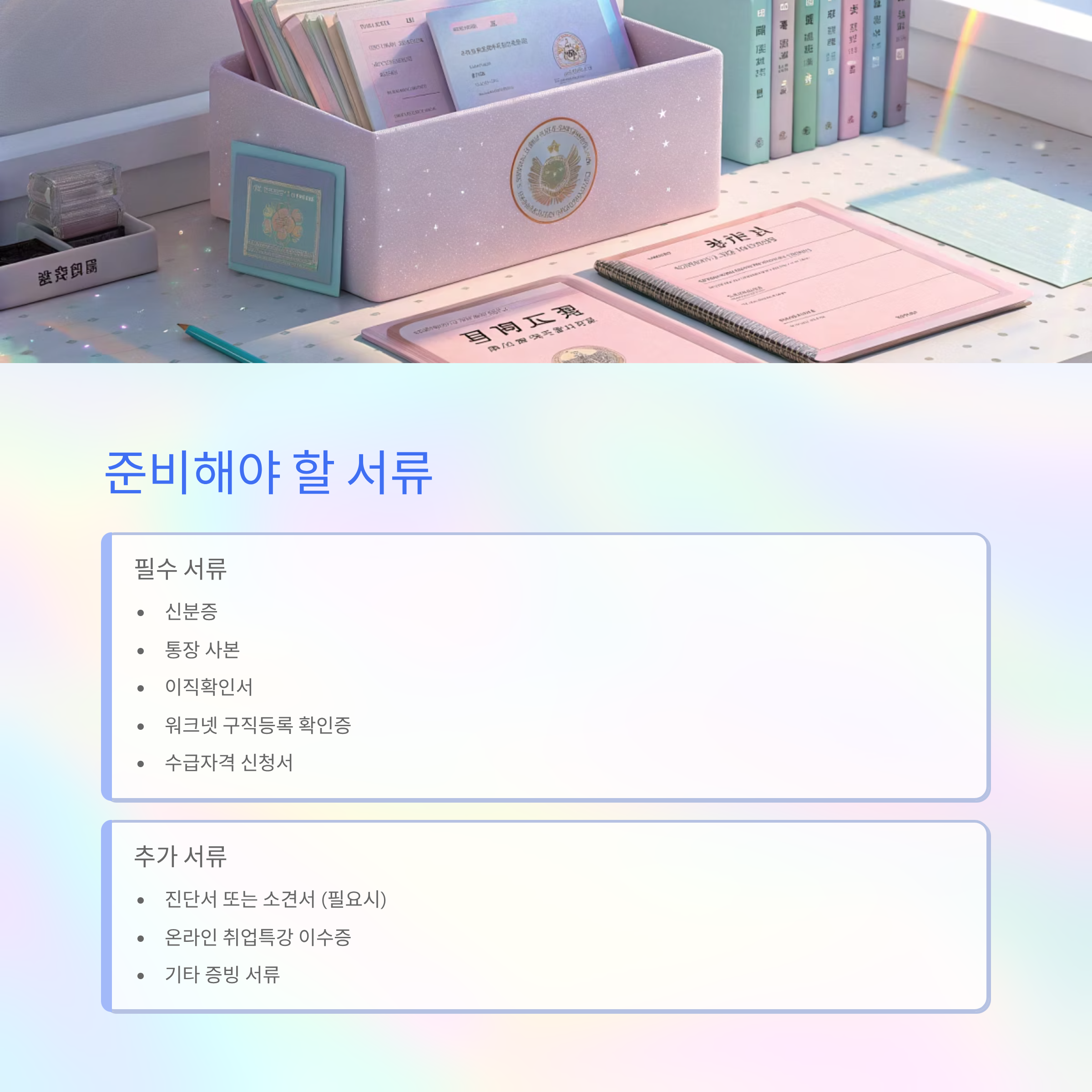 기본적으로 신분증, 통장 사본, 이직확인서, 워크넷 구직등록 확인증, 수급자격 신청서가 필요합니다. 경우에 따라 진단서나 소견서 같은 건강 관련 서류가 요구될 수 있으며, 온라인 취업특강을 수강했다면 이수증도 제출해야 합니다.