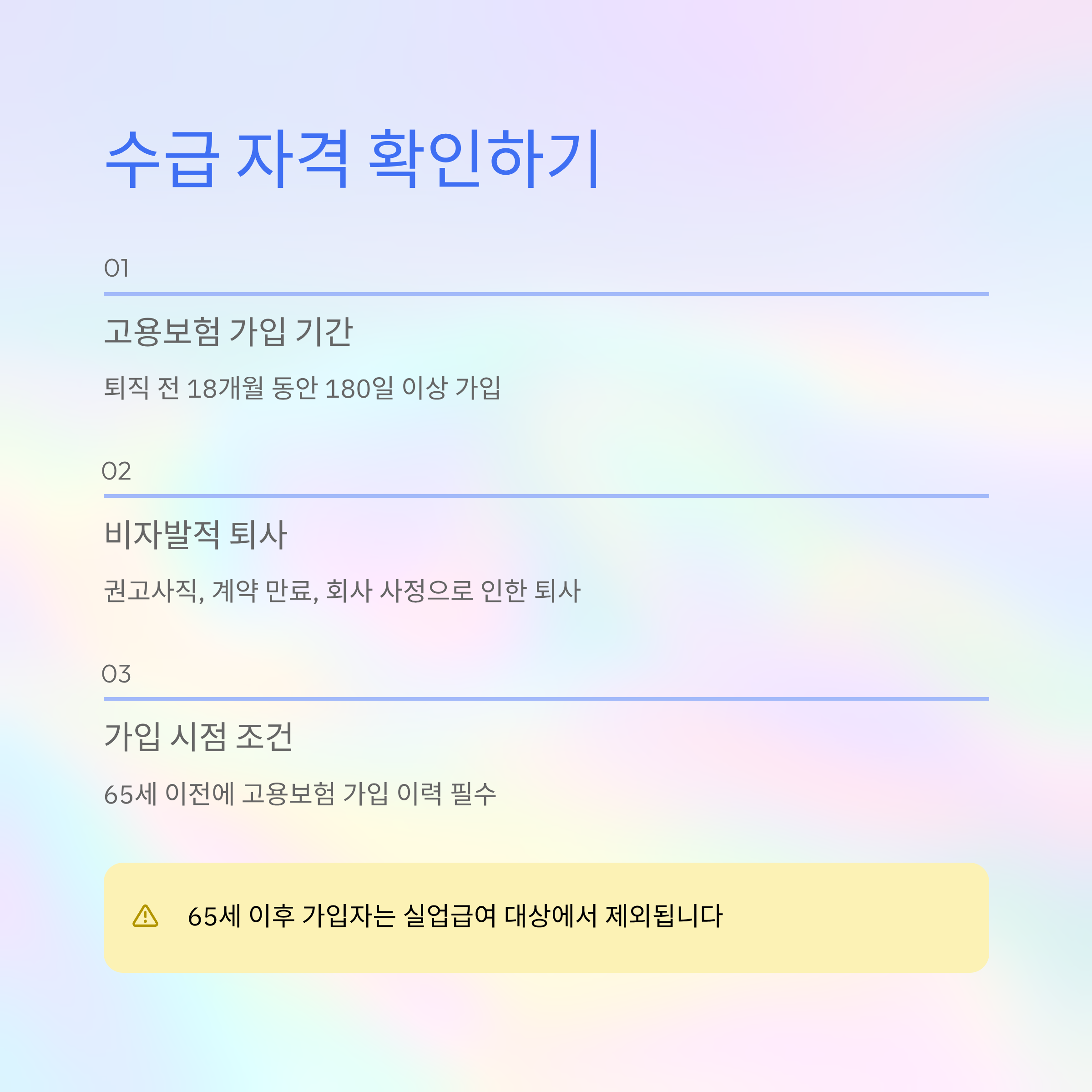 셋째, 65세 이전에 고용보험에 가입한 이력이 있어야 하며, 이후 가입자는 실업급여 대상에서 제외됩니다.