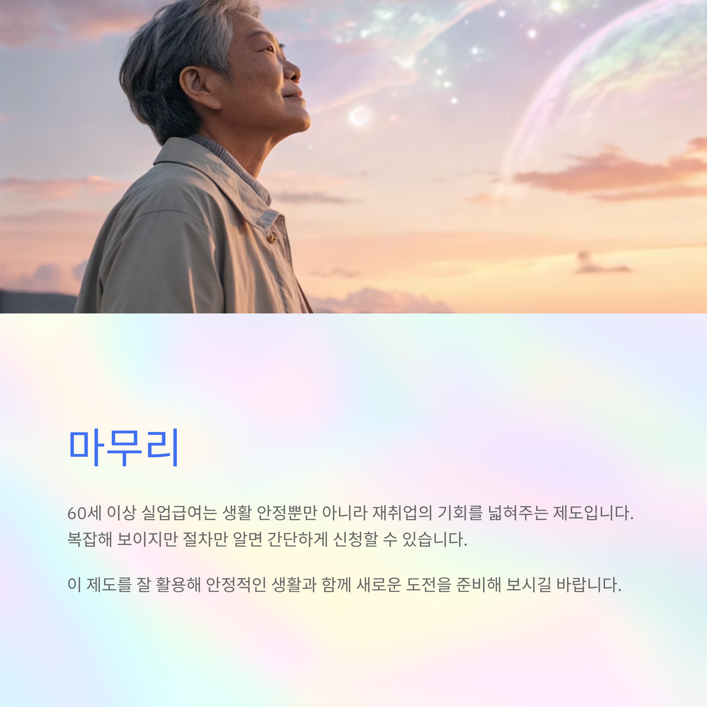 60세 이상 실업급여는 생활 안정뿐만 아니라 재취업의 기회를 넓혀주는 제도입니다. 복잡해 보이지만 절차만 알면 간단하게 신청할 수 있습니다. 이 제도를 잘 활용해 안정적인 생활과 함께 새로운 도전을 준비해 보시길 바랍니다.
