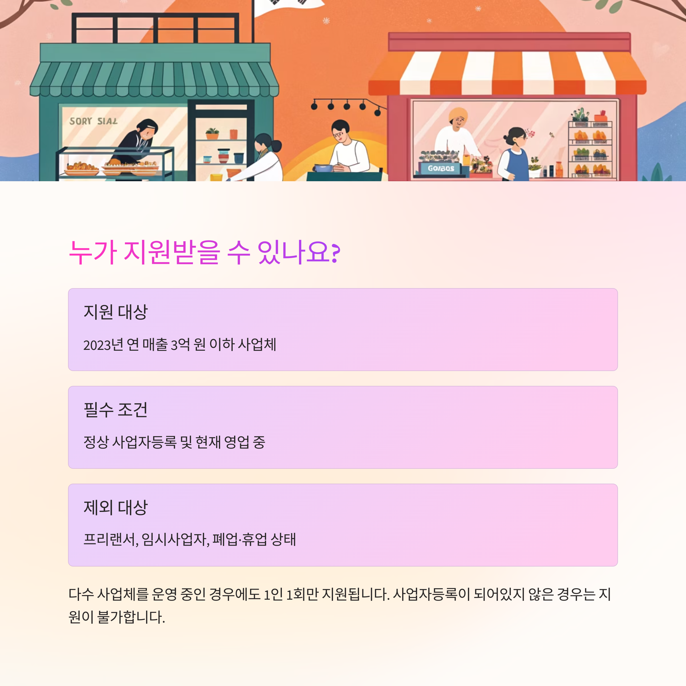 다수 사업체를 운영 중인 경우에도 1인 1회만 지원됩니다.
