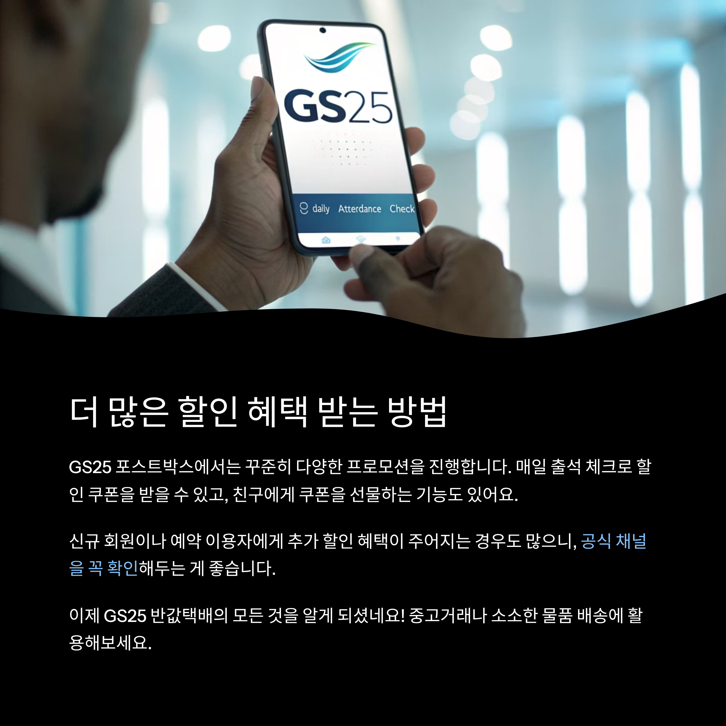 GS25 포스트박스에서는 꾸준히 다양한 프로모션을 진행합니다. 매일 출석 체크로 할인 쿠폰을 받을 수 있고, 친구에게 쿠폰을 선물하는 기능도 있어요.