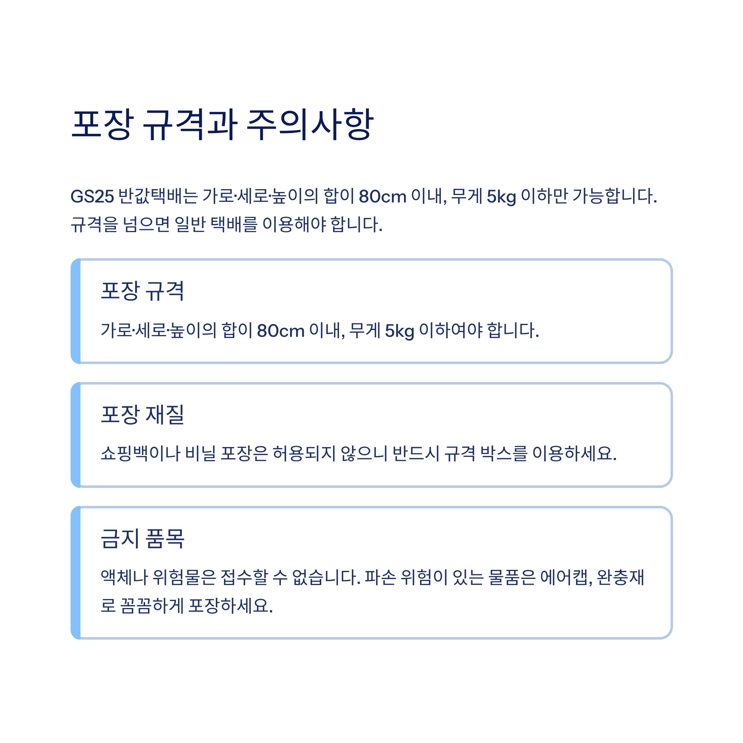 GS25 반값택배는 가로·세로·높이의 합이 80cm 이내, 무게 5kg 이하만 가능합니다. 규격을 넘으면 일반 택배를 이용해야 해요.