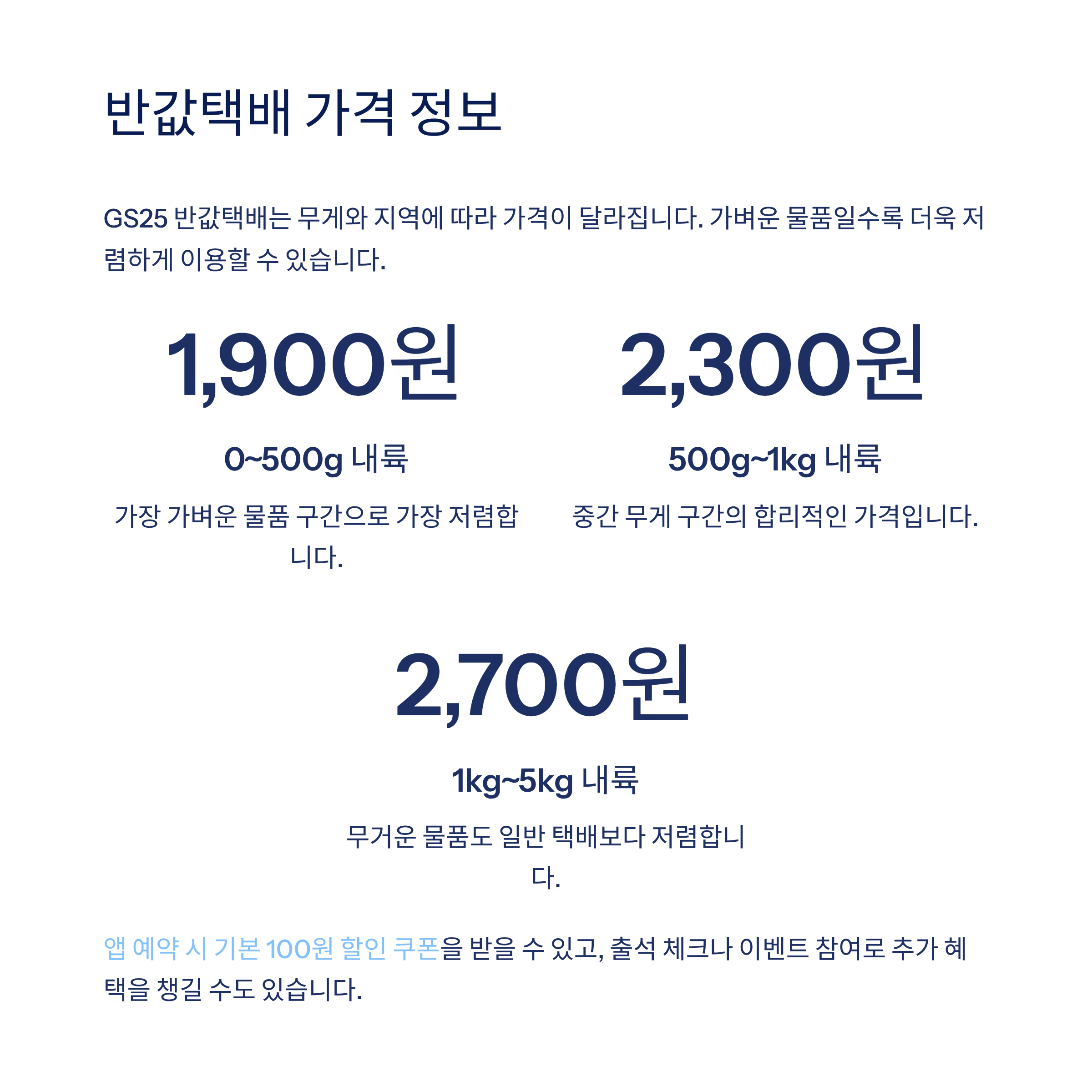 GS25 반값택배는 무게와 지역에 따라 가격이 달라집니다. 예를 들어 0~500g은 1,900원, 500g~1kg은 2,300원,