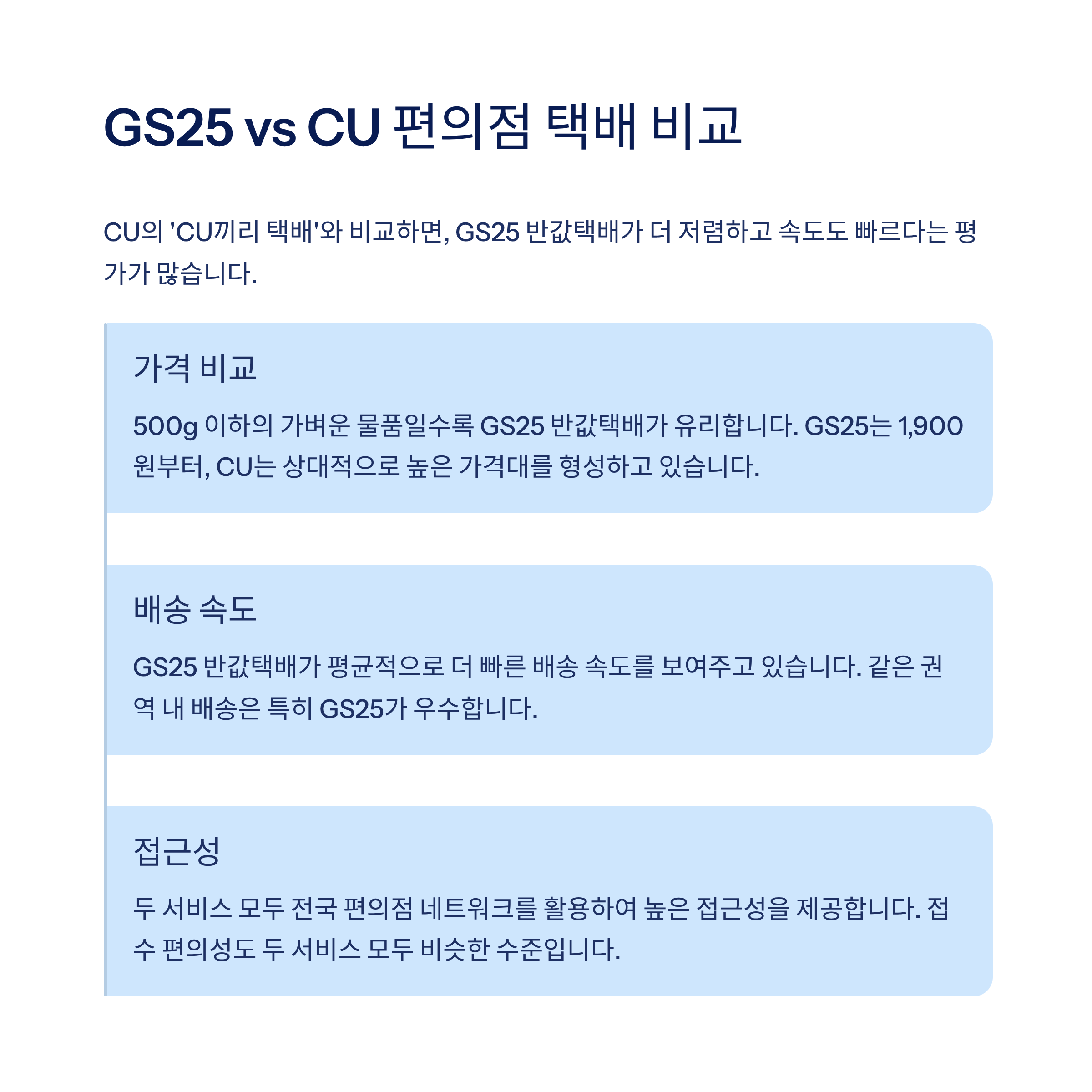 CU의 ‘CU끼리 택배’와 비교하면, GS25 반값택배가 더 저렴하고 속도도 빠르다는 평가가 많습니다.
