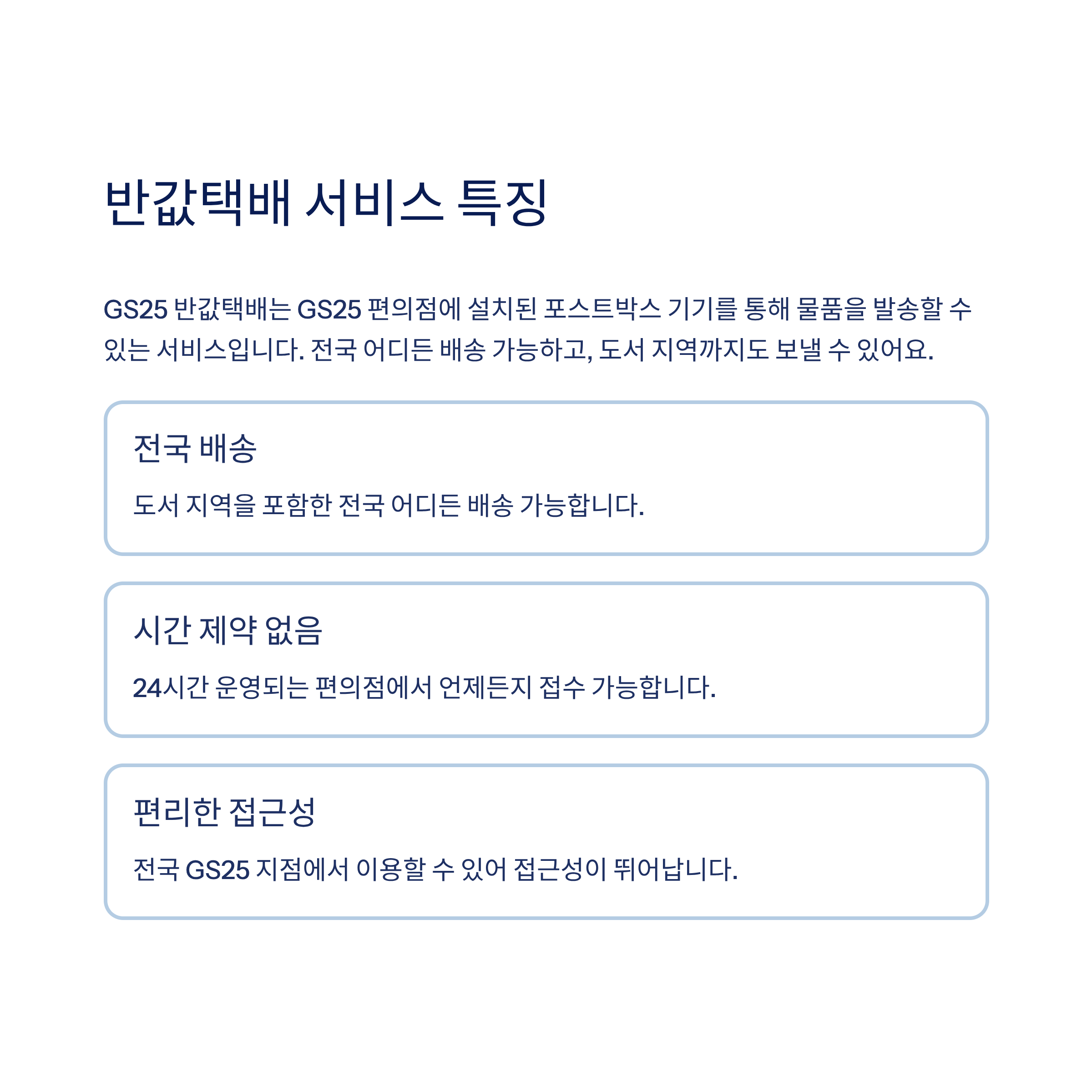 GS25 반값택배는 GS25 편의점에 설치된 포스트박스 기기를 통해 물품을 발송할 수 있는 서비스입니다. 전국 어디든 배송 가능하고, 도서 지역까지도 보낼 수 있어요. 가격이 절반 수준으로 저렴하고 접수 시간 제약이 없어 많은 사람들이 애용합니다.