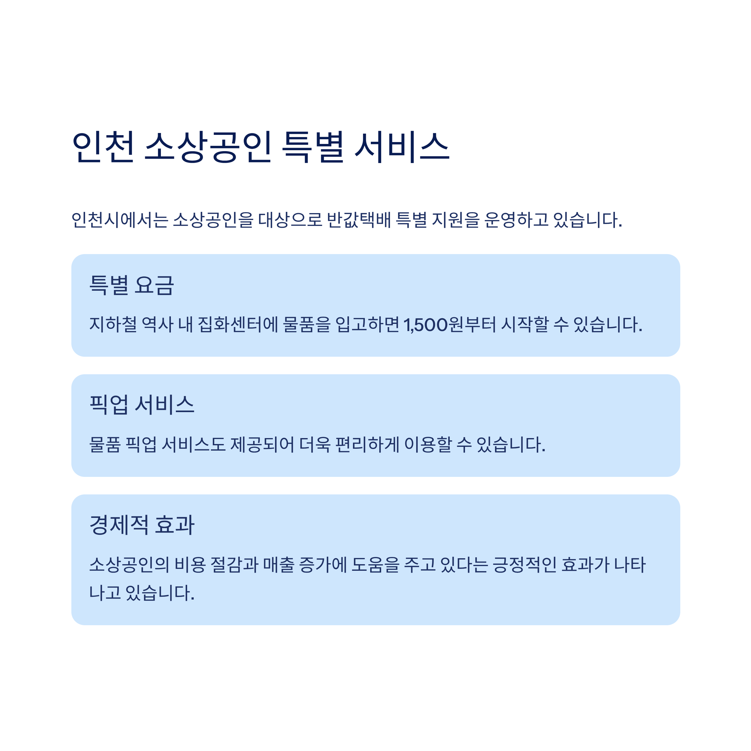 인천시에서는 소상공인을 대상으로 반값택배 특별 지원을 운영하고 있습니다. 지하철 역사 내 집화센터에 물품을 입고하면 1,500원부터 시작할 수 있고, 픽업 서비스도 제공돼 더 편리합니다.