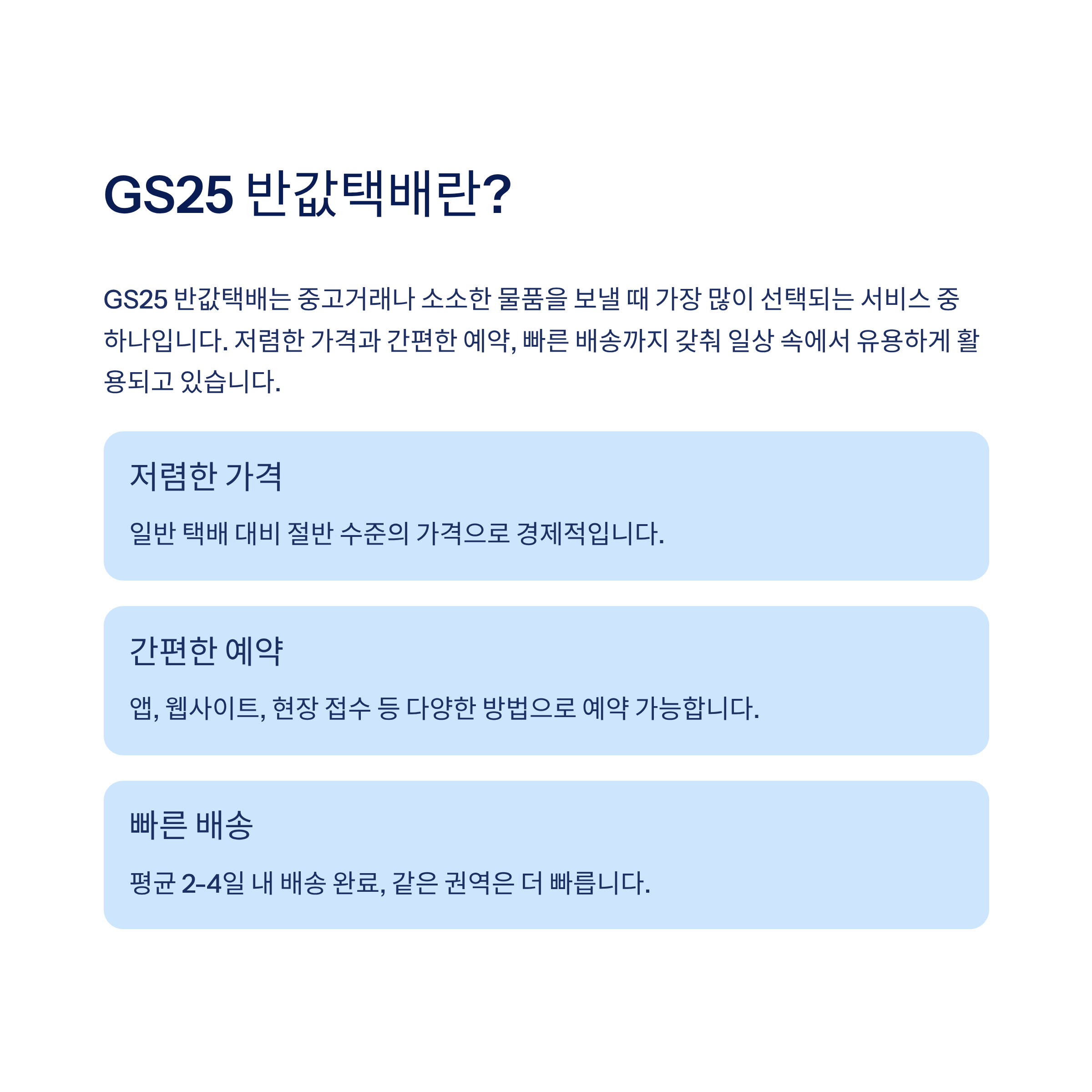GS25 반값택배는 중고거래나 소소한 물품을 보낼 때 가장 많이 선택되는 서비스 중 하나입니다. 저렴한 가격과 간편한 예약, 빠른 배송까지 갖춰 일상 속에서 유용하게 활용되고 있죠. 이번 글에서는 GS25 반값택배의 가격, 예약 방법, 발송 및 수령 절차, 할인 팁까지 전부 정리해드리겠습니다.