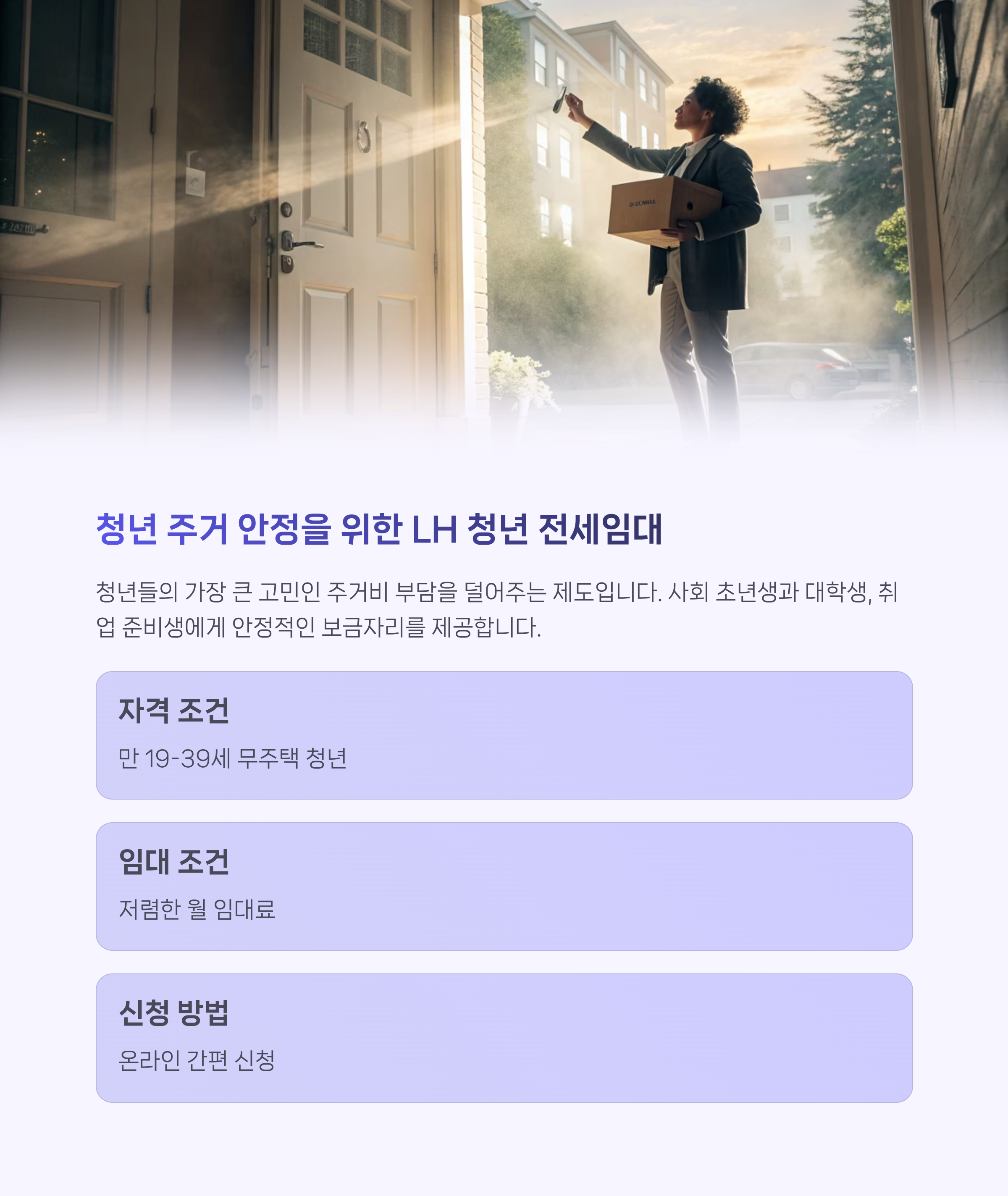 청년들의 가장 큰 고민 중 하나는 바로 주거비 부담입니다. LH 청년 전세임대는 이러한 고민을 덜어주는 제도로, 사회 초년생과 대학생, 취업 준비생에게 안정적인 보금자리를 마련할 수 있는 기회를 제공합니다. 이번 글에서는 자격 조건, 임대 조건, 신청 방법, 그리고 신청 시 유의사항까지 꼼꼼히 정리해 드리겠습니다.