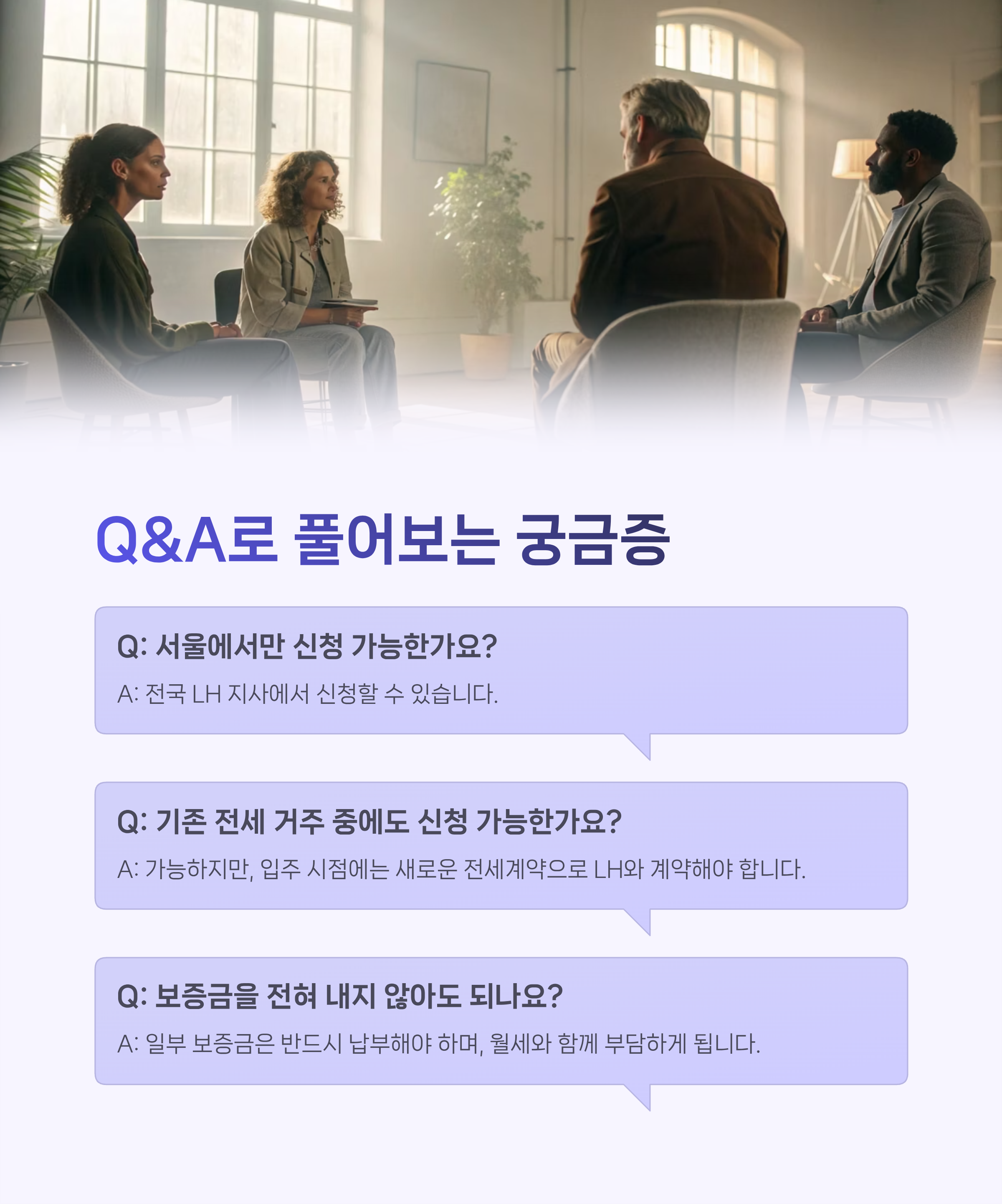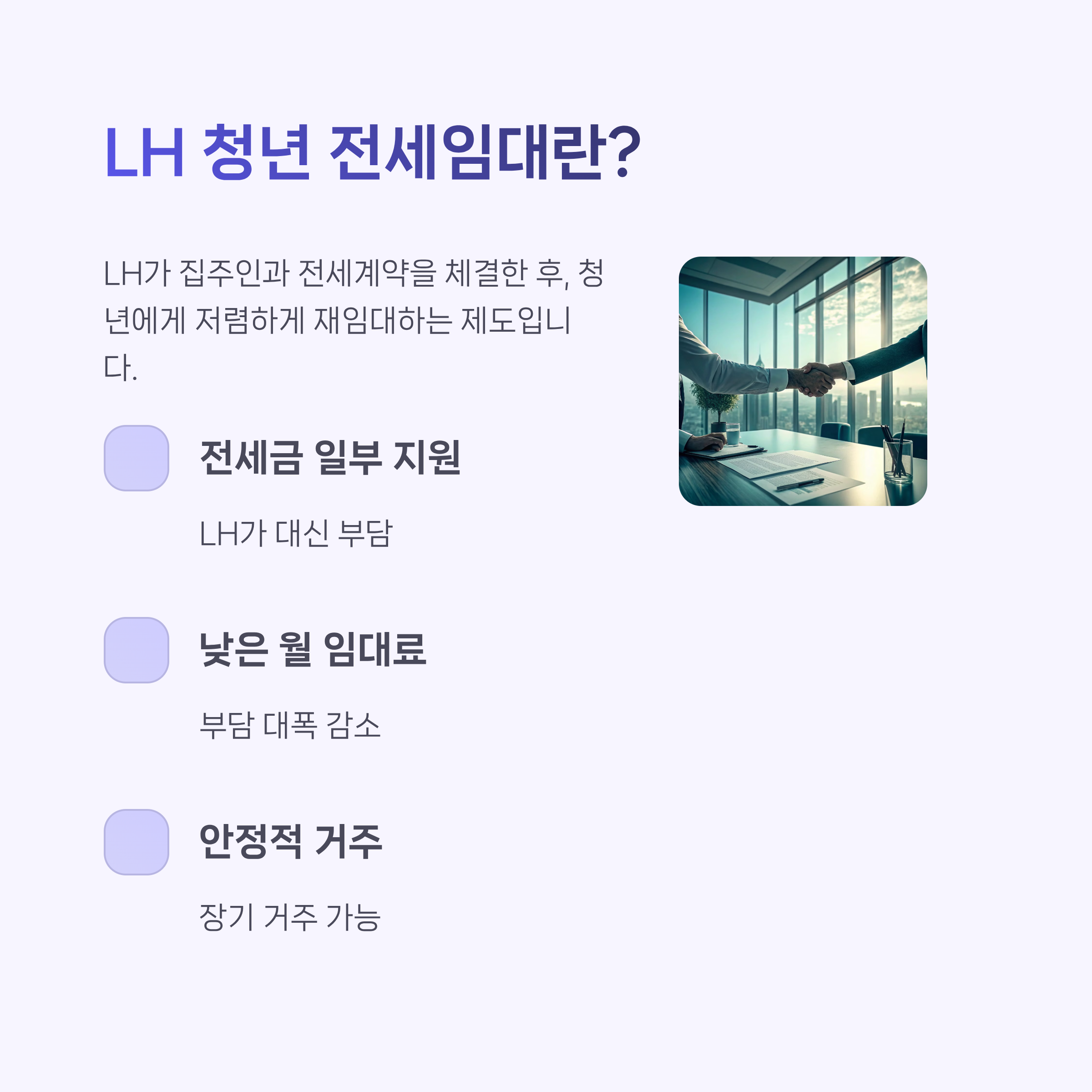 LH가 집주인과 전세계약을 체결한 후, 청년에게 저렴하게 재임대하는 제도입니다. 전세금 일부를 LH가 대신 부담해 주기 때문에 월 임대료가 낮아지고, 안정적으로 거주할 수 있는 장점이 있습니다.