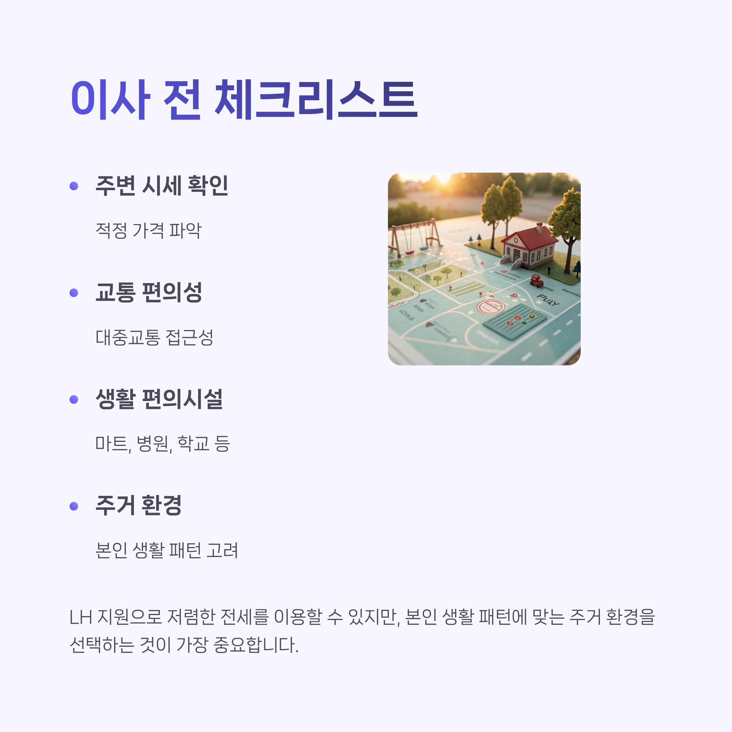 주변 시세를 확인하고, 교통과 생활 편의시설도 꼼꼼히 살펴보는 것이 좋습니다. LH 지원으로 저렴한 전세를 이용할 수 있지만, 본인 생활 패턴에 맞는 주거 환경을 선택하는 것이 가장 중요합니다.
