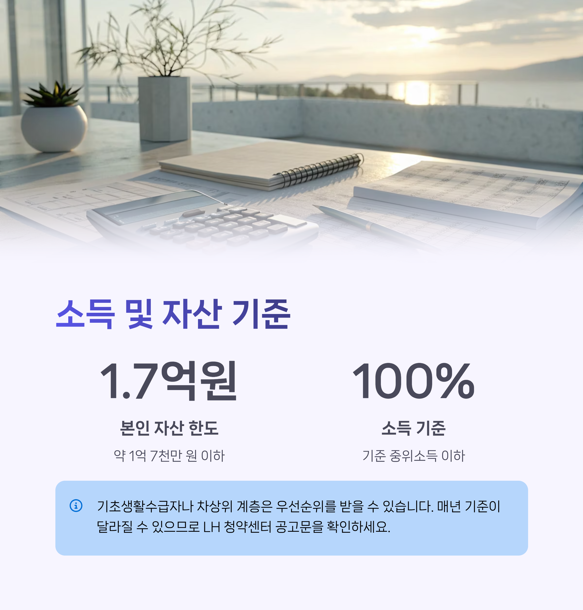 본인 자산은 약 1억 7천만 원 이하, 부모님 자산도 일정 수준 이하로 제한됩니다. 매년 기준이 달라질 수 있으므로 반드시 LH 청약센터 공고문을 확인하는 것이 중요합니다. 기초생활수급자나 차상위 계층은 우선순위를 받을 수 있습니다.