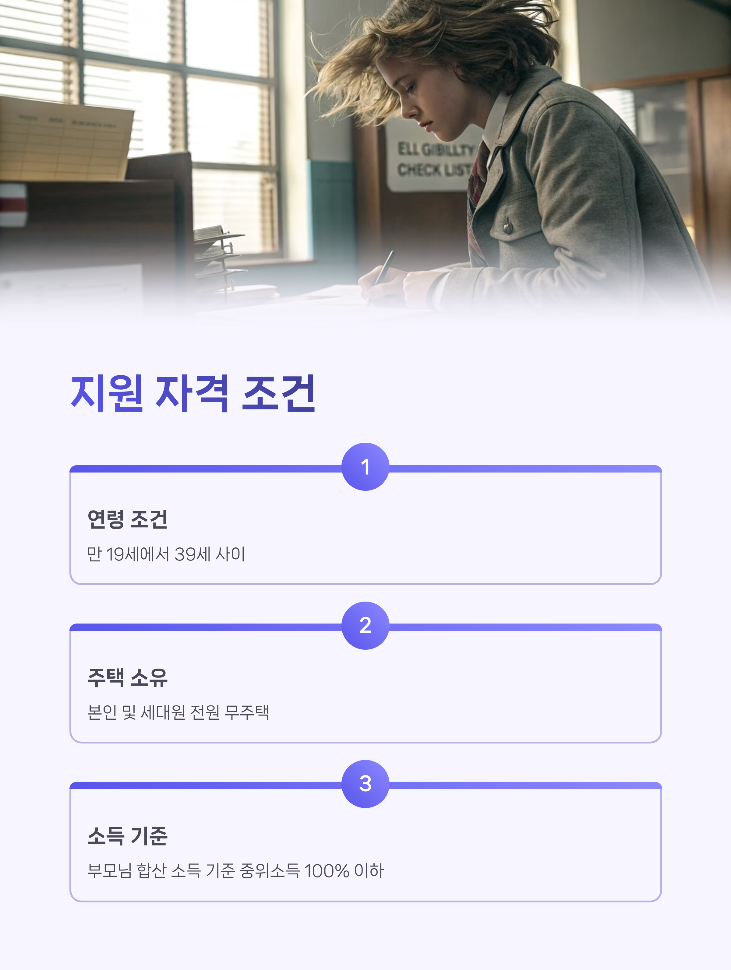만 19세에서 39세 사이의 무주택 청년이라면 신청이 가능합니다. 본인뿐만 아니라 세대원 전원이 무주택이어야 하며, 소득과 자산 기준도 충족해야 합니다. 부모님과 합산 소득이 기준 중위소득 100% 이하일 경우 지원할 수 있습니다.