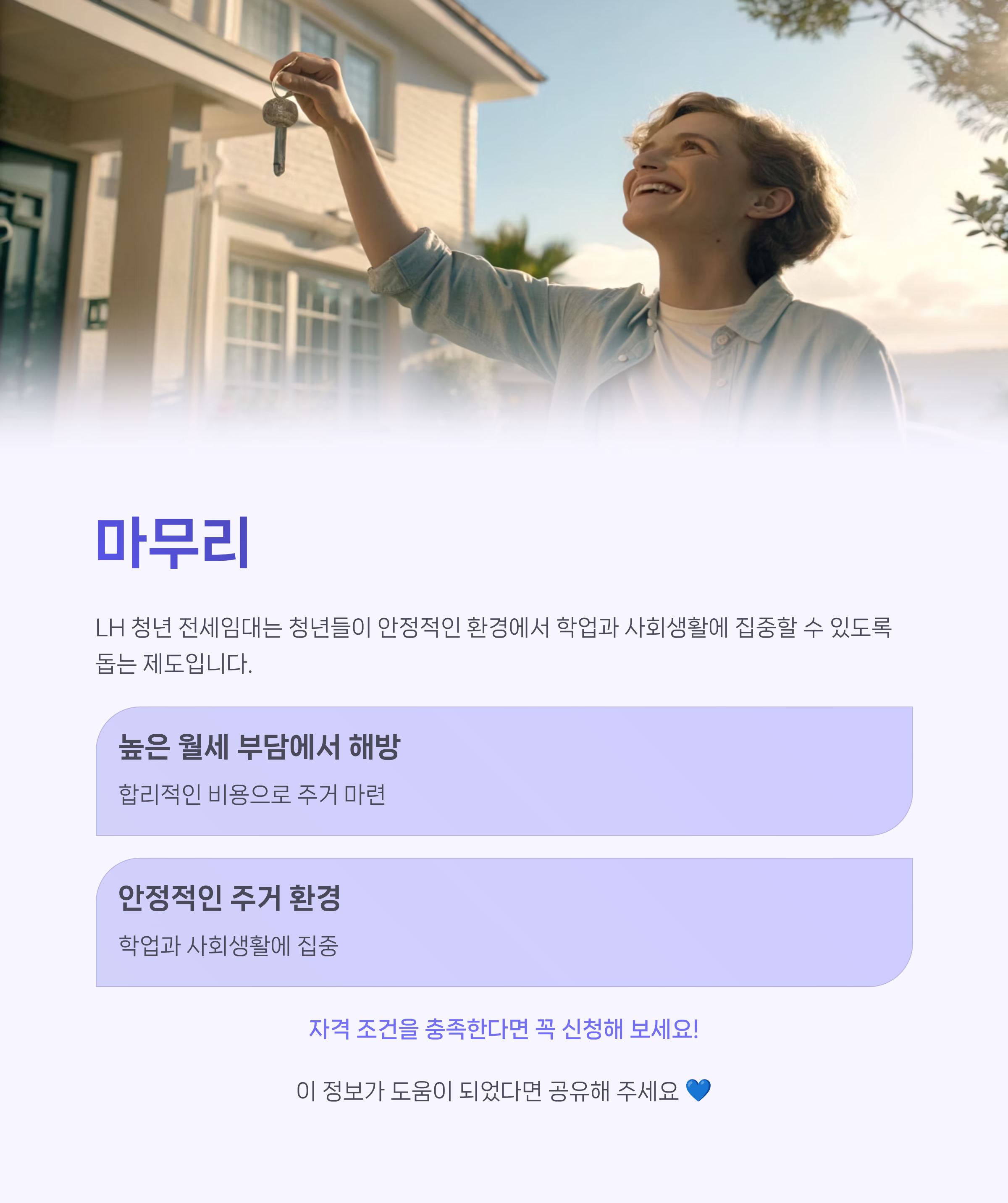 LH 청년 전세임대는 청년들이 안정적인 환경에서 학업과 사회생활에 집중할 수 있도록 돕는 제도입니다. 높은 월세 부담에서 벗어나 합리적인 비용으로 주거를 마련할 수 있는 기회이니, 자격 조건을 충족한다면 꼭 신청해 보시길 권해드립니다.