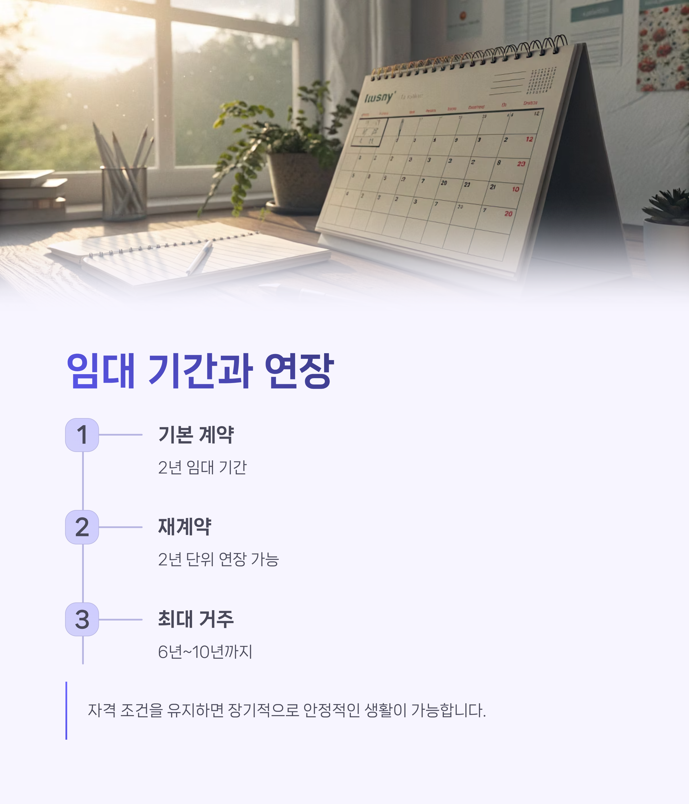 기본 임대 기간은 2년이며, 자격 조건을 유지하면 2년 단위로 재계약이 가능합니다. 최대 6년에서 10년까지 거주할 수 있어 장기적으로 안정적인 생활이 가능합니다.