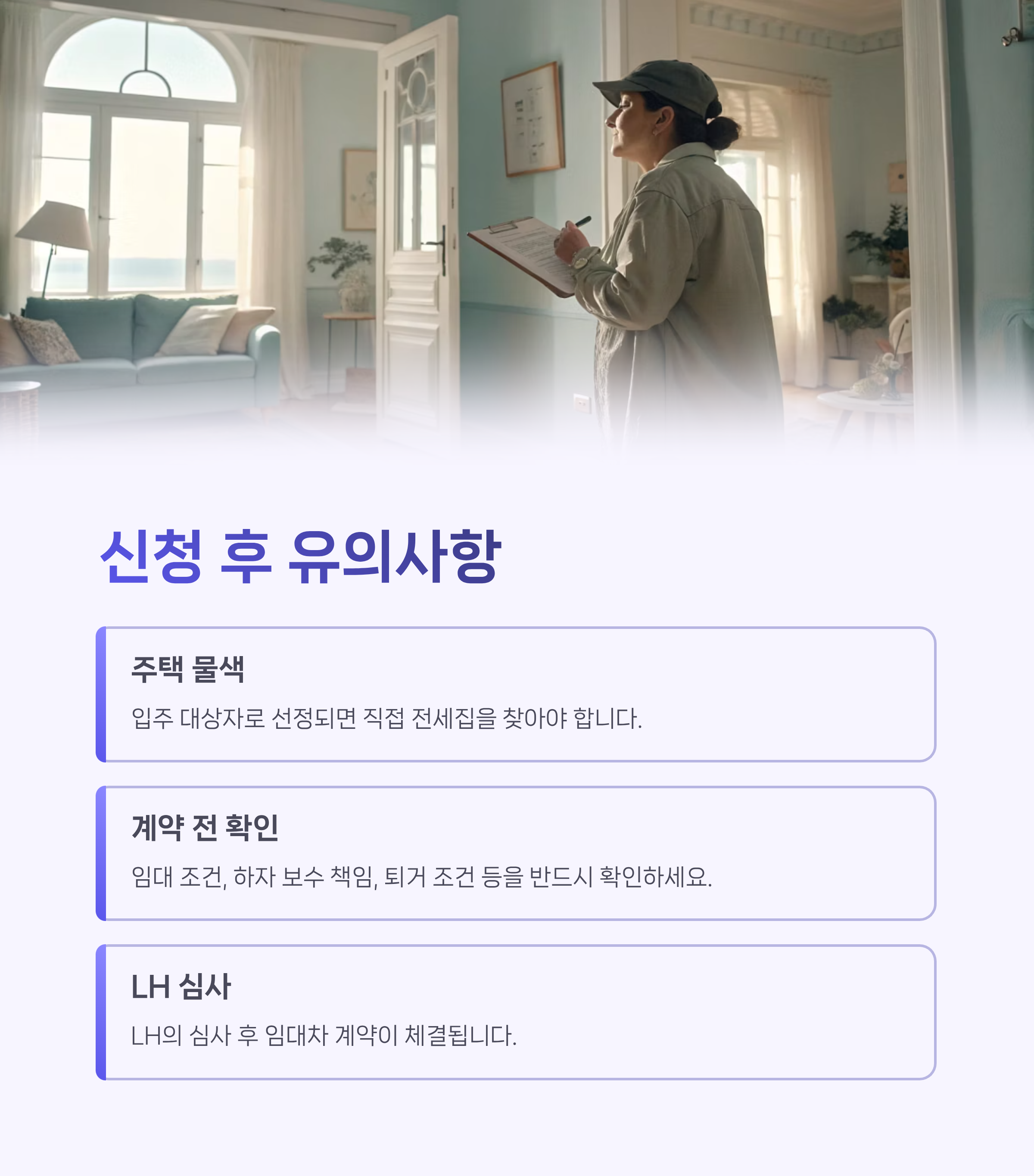 입주 대상자로 선정되면 직접 전세집을 찾아야 하며, LH의 심사 후 임대차 계약이 체결됩니다. 계약 전에는 임대 조건, 하자 보수 책임, 퇴거 조건 등을 반드시 확인해야 합니다.