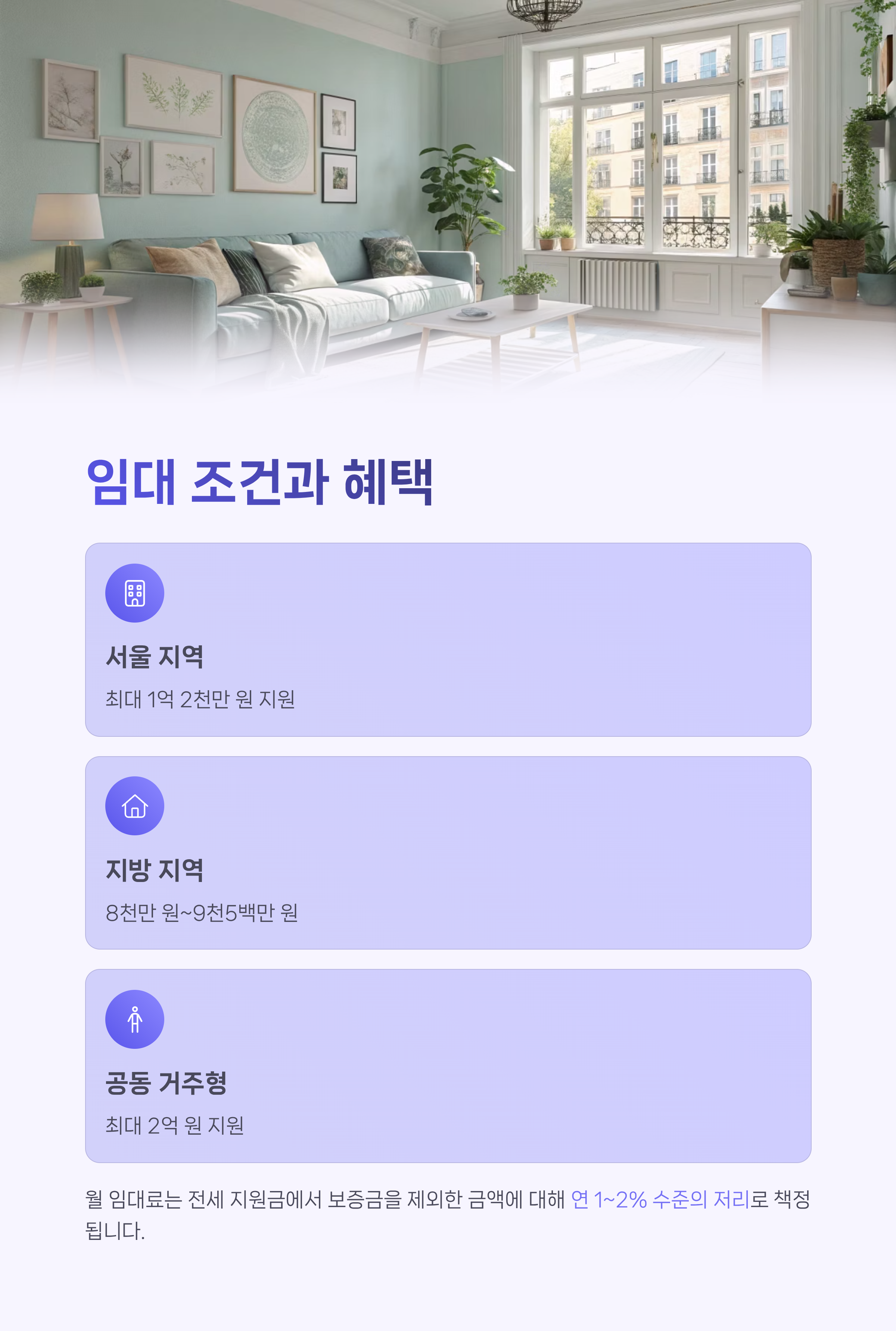 서울은 최대 1억 2천만 원, 지방은 8천만 원에서 9천5백만 원까지 전세보증금을 지원받을 수 있습니다. 2~3인 공동 거주형은 최대 2억 원까지 지원되며, 월 임대료는 전세 지원금에서 보증금을 제외한 금액에 대해 연 1~2% 수준의 저리로 책정됩니다.