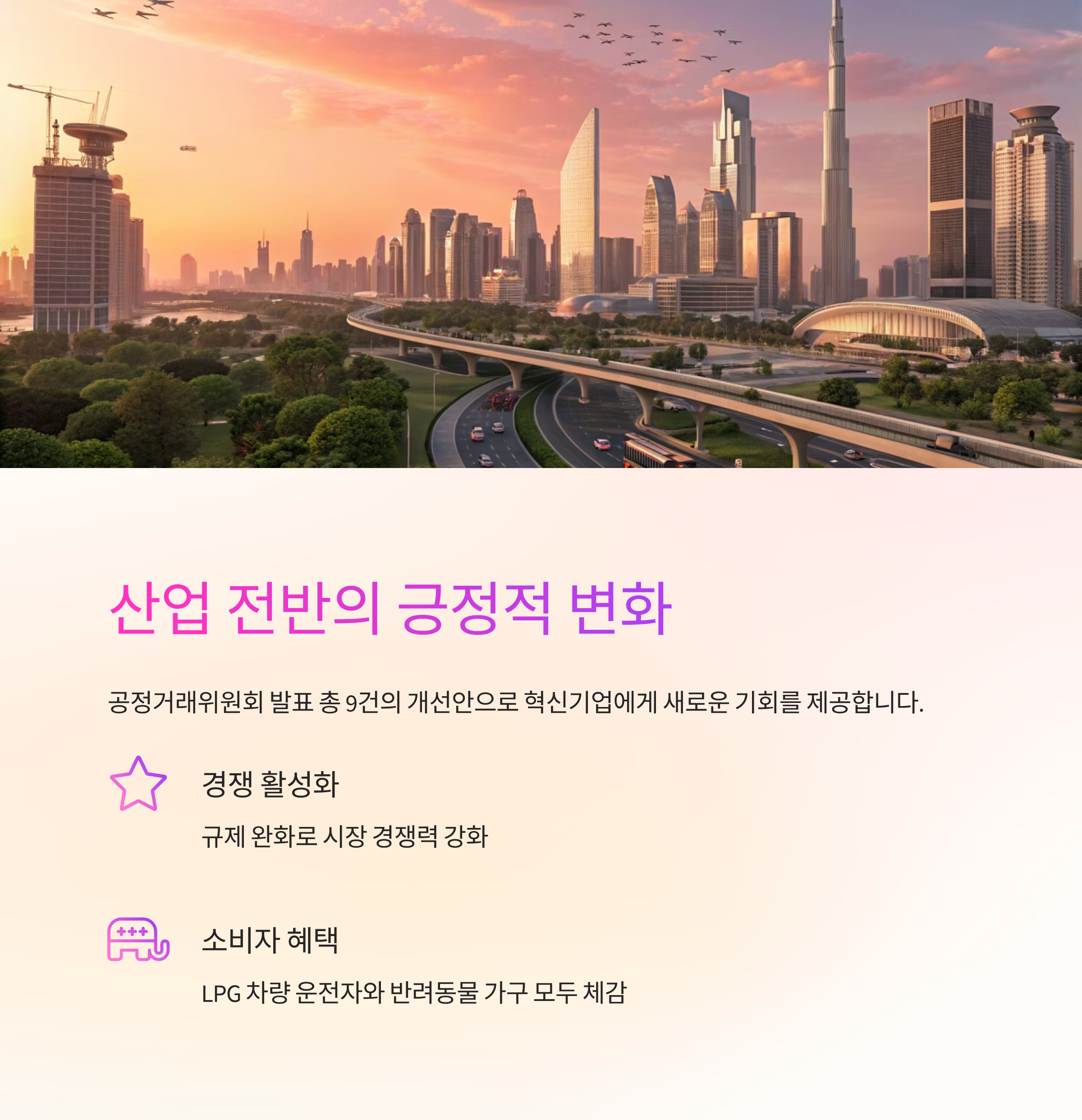 공정거래위원회가 발표한 이번 개선안은 총 9건으로, 새로운 산업 진입을 준비하는 혁신기업에게 기회가 될 전망입니다. 규제가 완화되면 경쟁이 활성화되고, 결국 소비자와 기업 모두에게 긍정적인 변화가 돌아올 수 있습니다. LPG 차량 운전자와 반려동물 양육 가구 모두 체감할 수 있는 변화가 다가오고 있습니다.