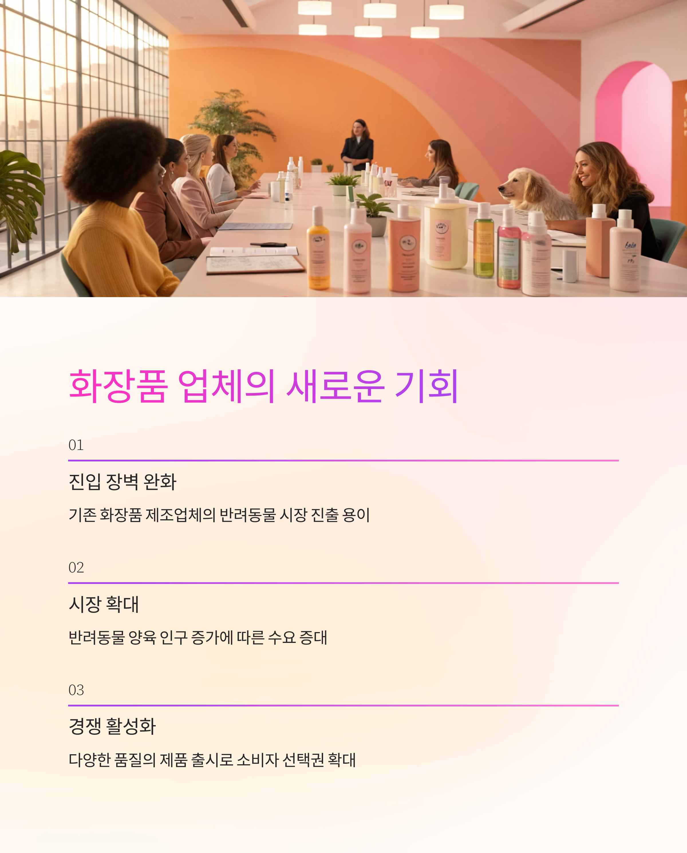 규제 완화로 기존 화장품 제조업체들이 반려동물 제품 시장에 진출하기 쉬워졌습니다. 반려동물 양육 인구가 늘어나는 현실 속에서 품질 좋은 제품이 다양하게 출시될 가능성이 큽니다. 이는 소비자에게 더 많은 선택권을 제공하고 시장 경쟁을 활발하게 만들 수 있습니다.