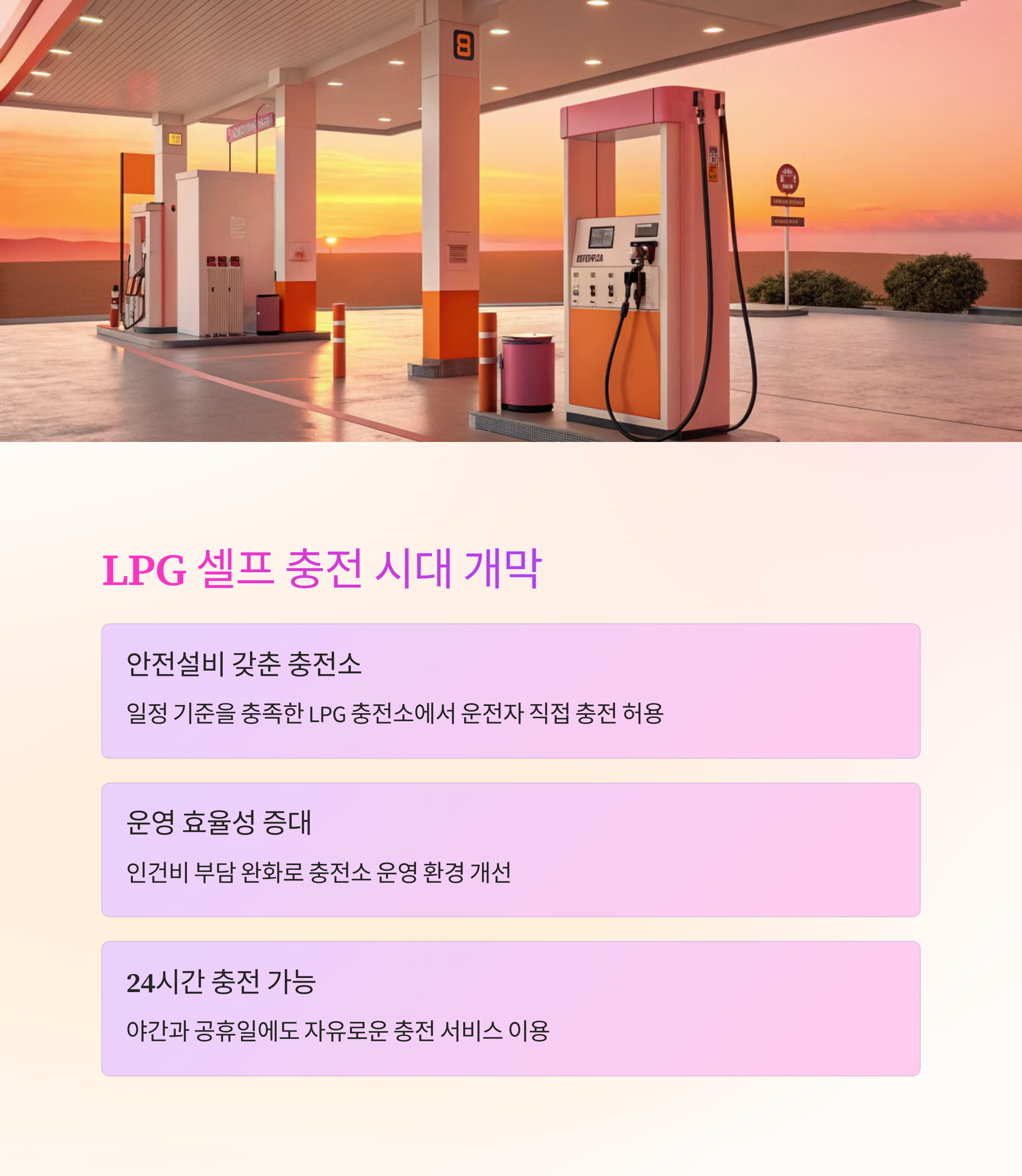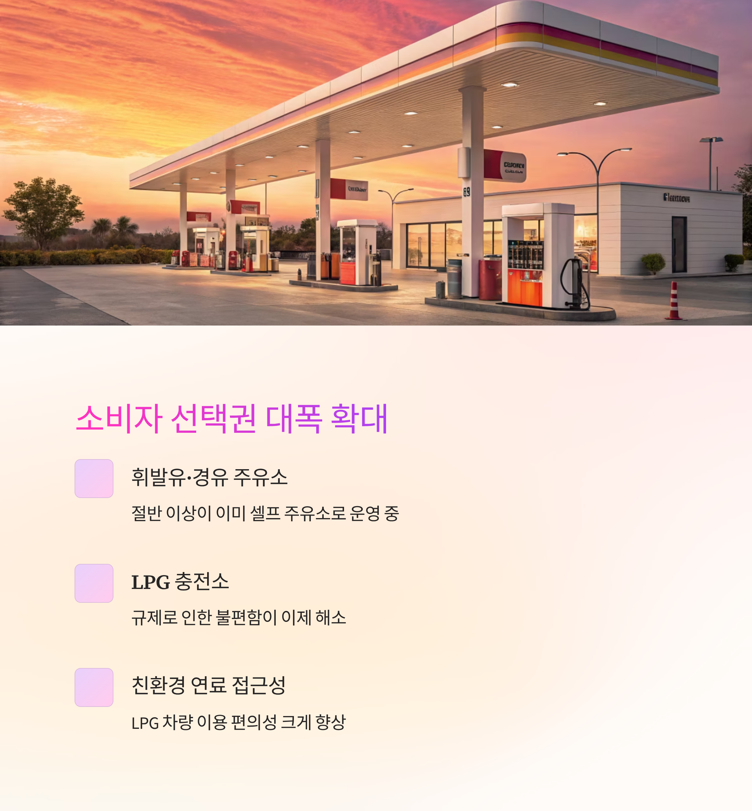 | LPG 셀프 충전 | 운영비 절감, 충전소 감소세 완화, 소비자 편익 증대 |