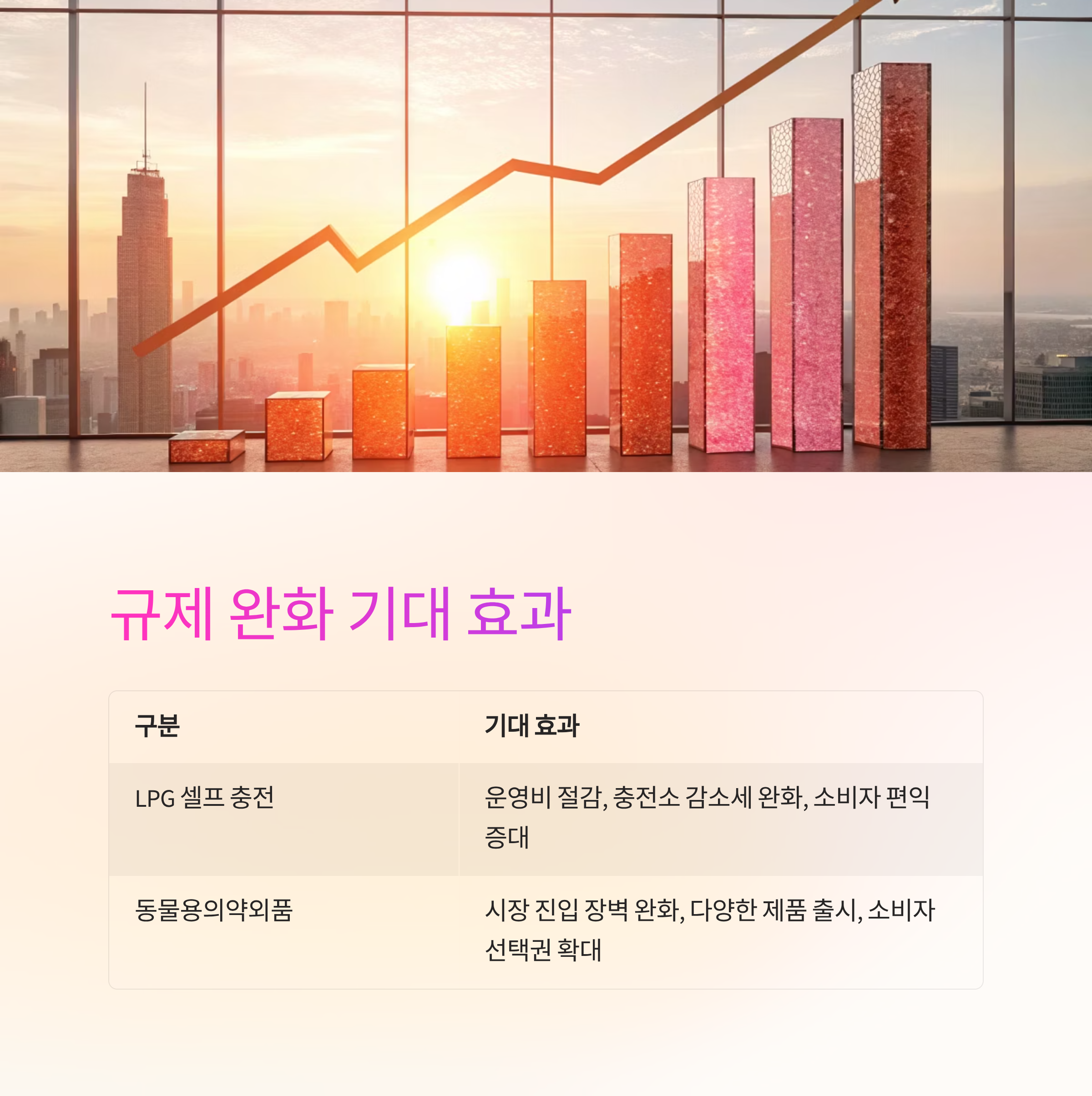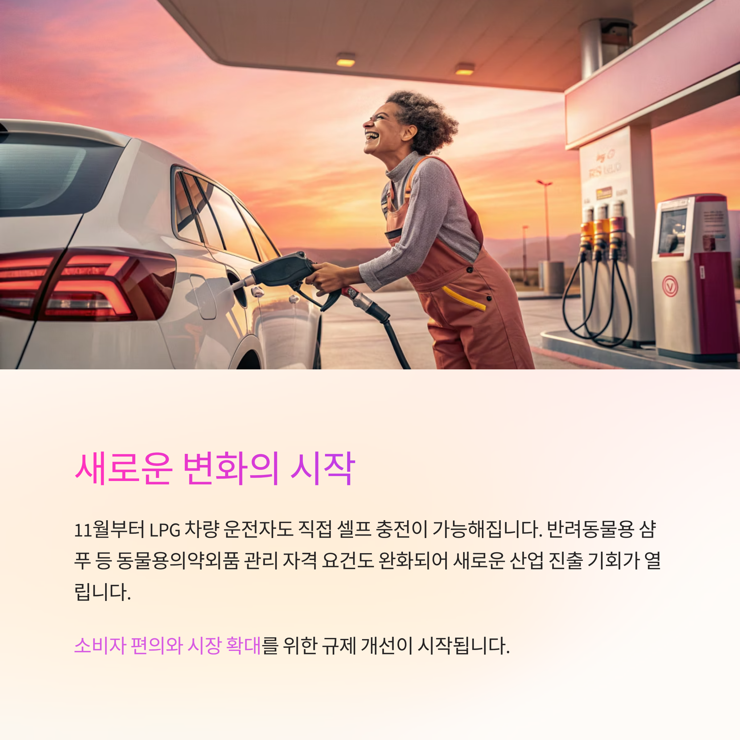 올해 11월부터 LPG 차량 운전자도 직접 셀프 충전을 할 수 있게 됩니다. 그동안 직원만 충전할 수 있었던 규제가 풀리면서 소비자 편의는 물론 충전소 운영 환경에도 변화가 예상되는데요. 여기에 더해 반려동물용 샴푸 등 동물용의약외품 관리 자격 요건도 완화되며 새로운 산업 진출 기회가 열리고 있습니다. 이번 규제 개선안이 시장과 소비자에게 어떤 변화를 가져올지 정리해 보겠습니다.