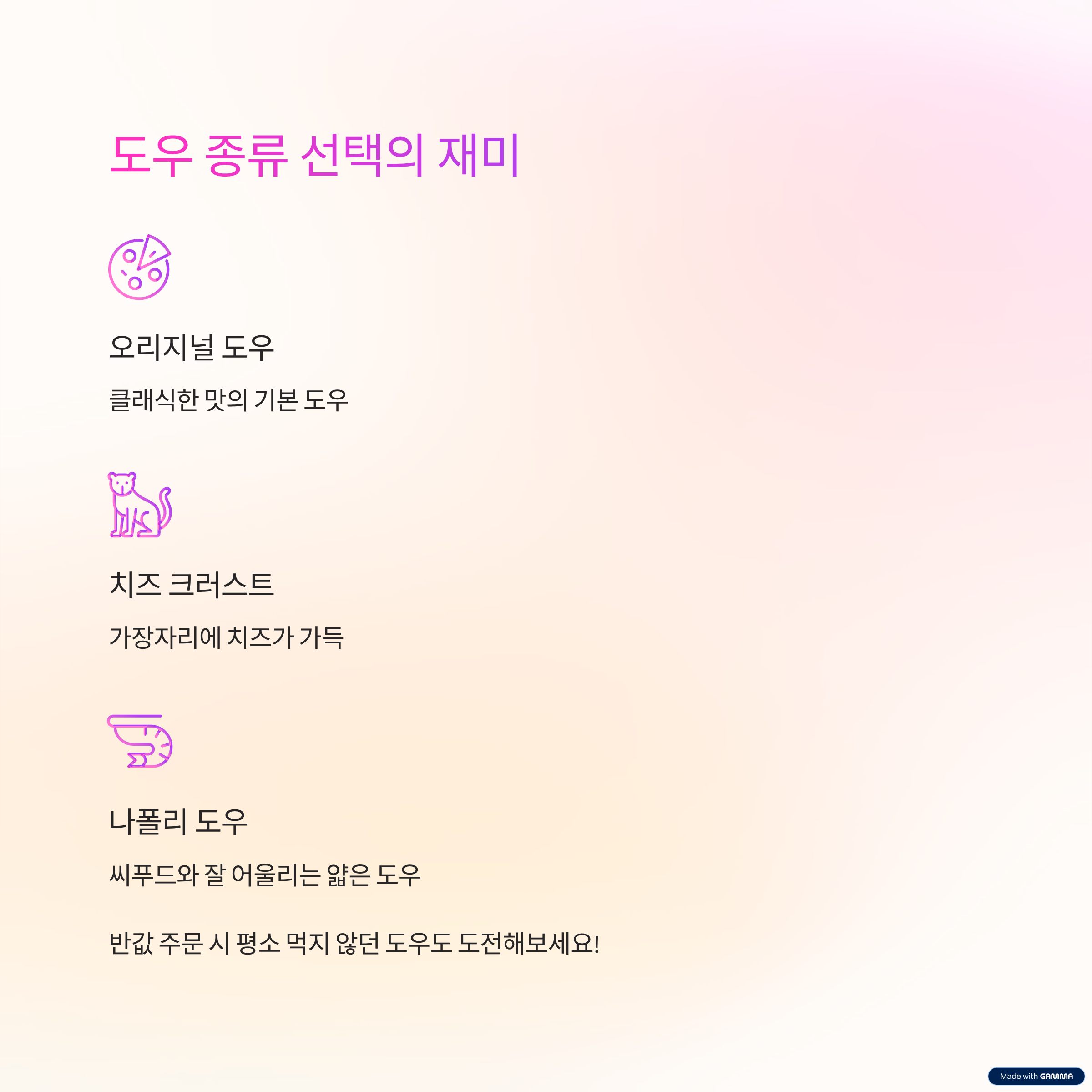 도미노피자의 매력은 다양한 도우 선택에도 있습니다. 기본 오리지널 도우부터 치즈 크러스트, 씨푸드와 어울리는 나폴리 도우까지 기호에 맞게 고르면 만족도가 확 올라갑니다. 반값에 주문할 때는 평소 먹지 않던 도우도 도전해보기 좋아요.