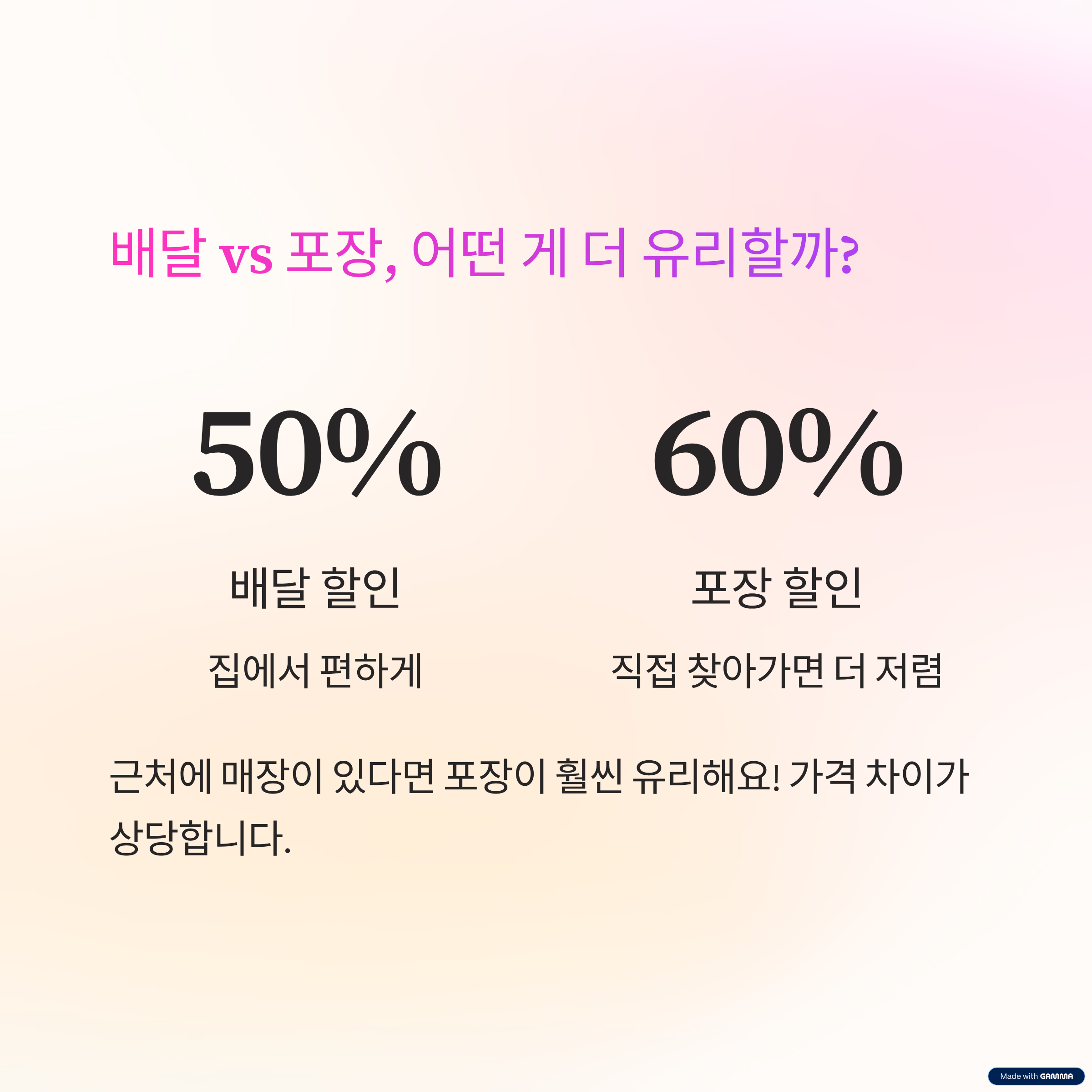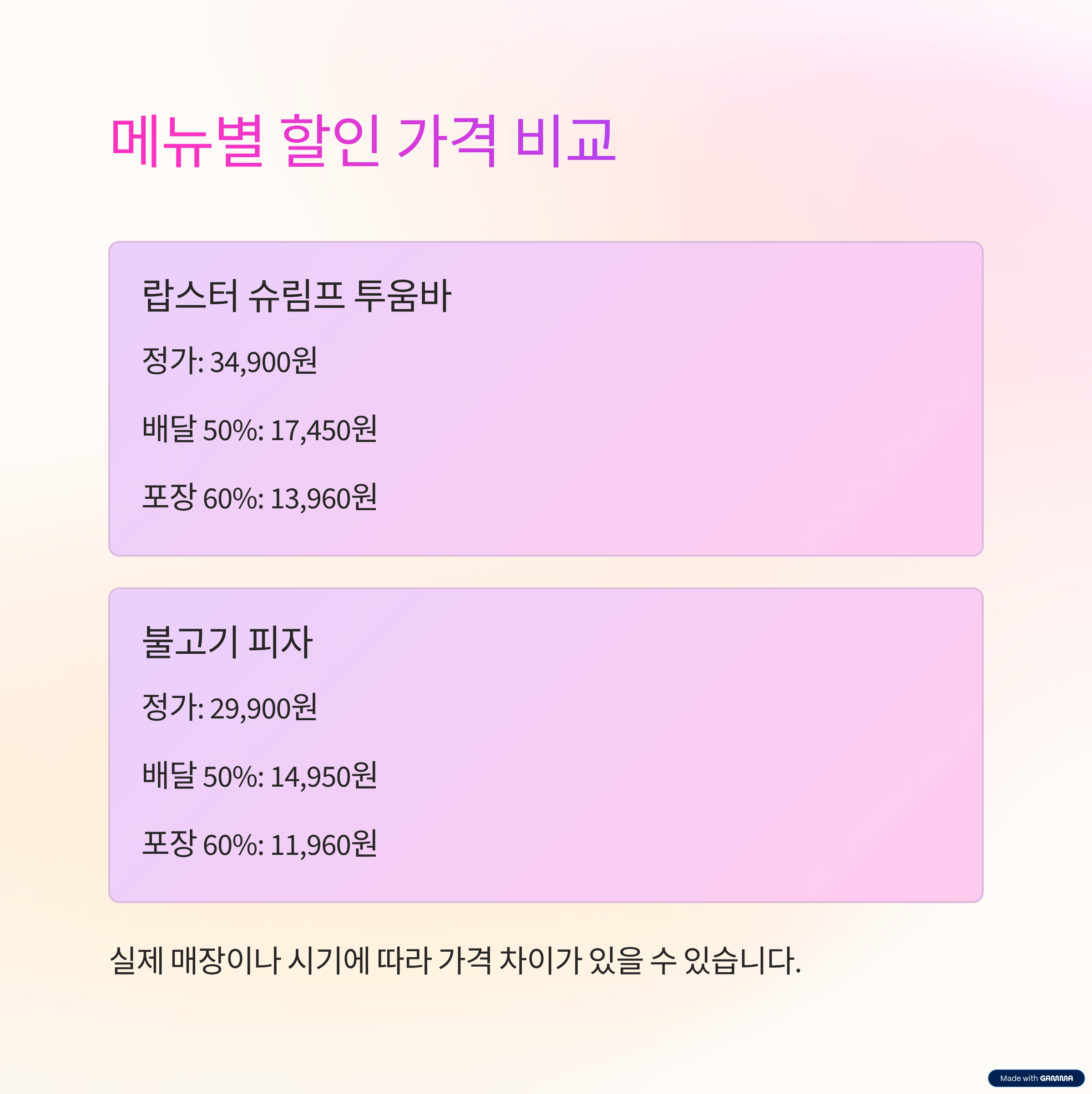 이번 프로모션의 핵심은 할인율입니다. 배달 주문 시 최대 50% 할인, 매장에서 직접 찾아가는 방문포장은 무려 60%까지 할인되기 때문에 가격 차이가 큽니다. 근처에 매장이 있다면 포장이 훨씬 유리하겠죠.