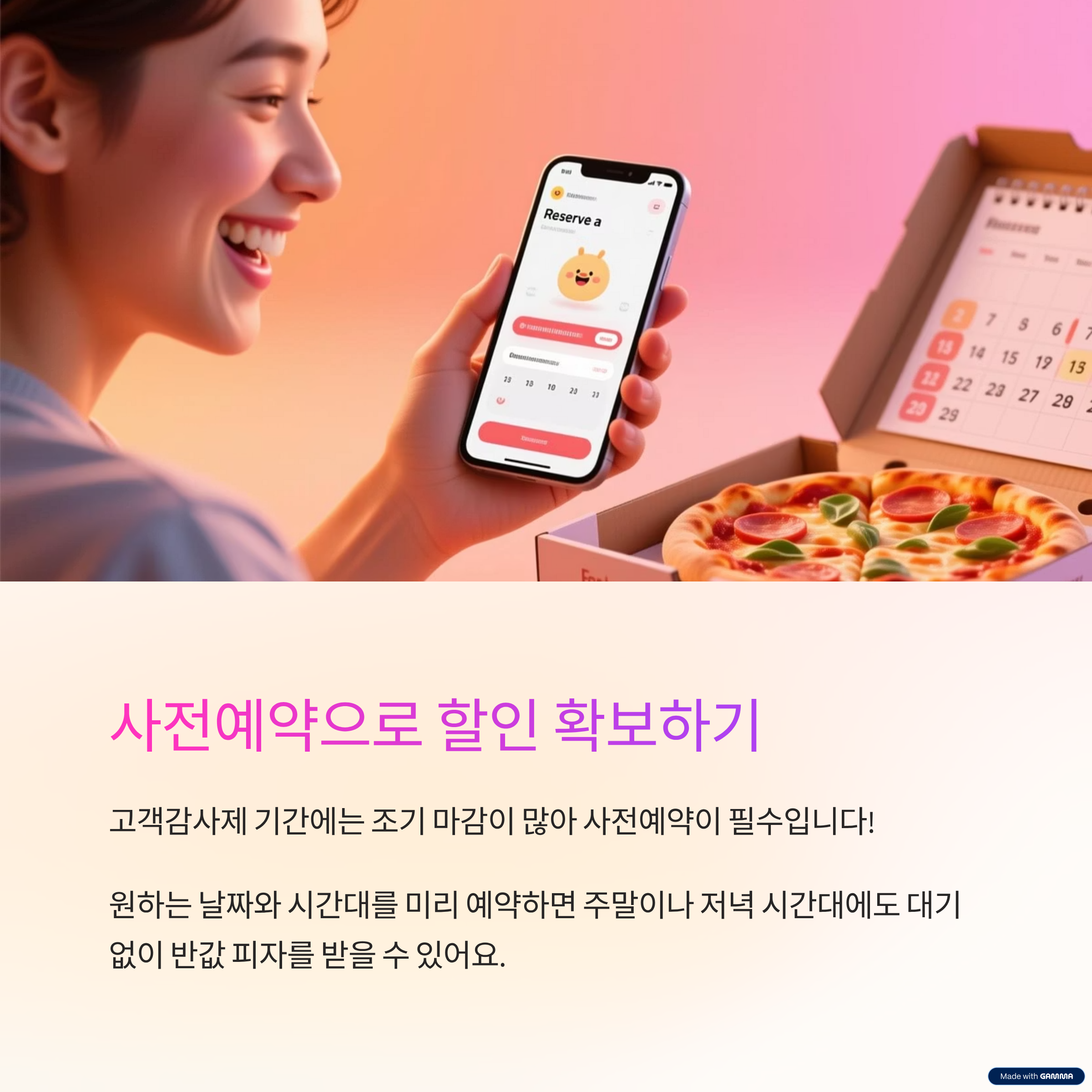 도미노피자 이벤트는 사전예약을 활용하면 더욱 여유롭게 주문할 수 있습니다. 원하는 날짜와 시간대를 미리 예약해두면 주말이나 저녁 시간대에도 긴 대기 없이 반값 피자를 받아볼 수 있어요. 특히 고객감사제 기간에는 조기 마감이 많기 때문에 사전예약은 필수입니다.