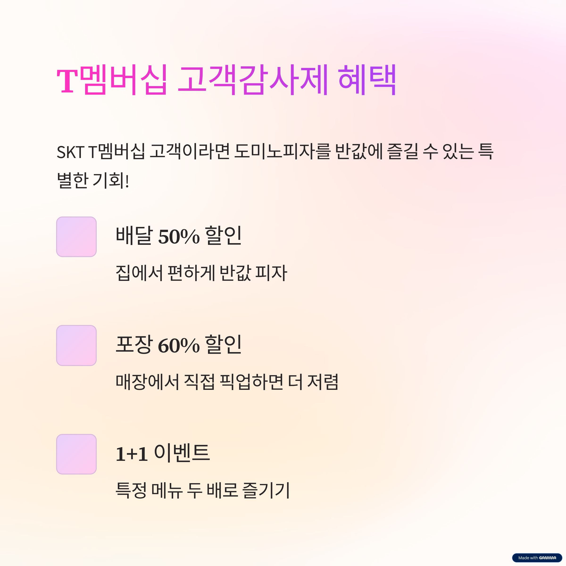 SKT T멤버십 고객이라면 도미노피자를 반값에 맛볼 수 있는 특별한 혜택이 열리고 있습니다. 배달, 포장, 심지어 일부 메뉴에서는 1+1 이벤트까지 진행되어 알뜰하게 피자를 즐기고 싶은 분들께 최고의 기회가 될 수 있습니다. 이번 글에서는 SKT 도미노피자 50% 할인 사전예약 방법부터 인기 메뉴와 실제 후기를 함께 살펴보겠습니다.