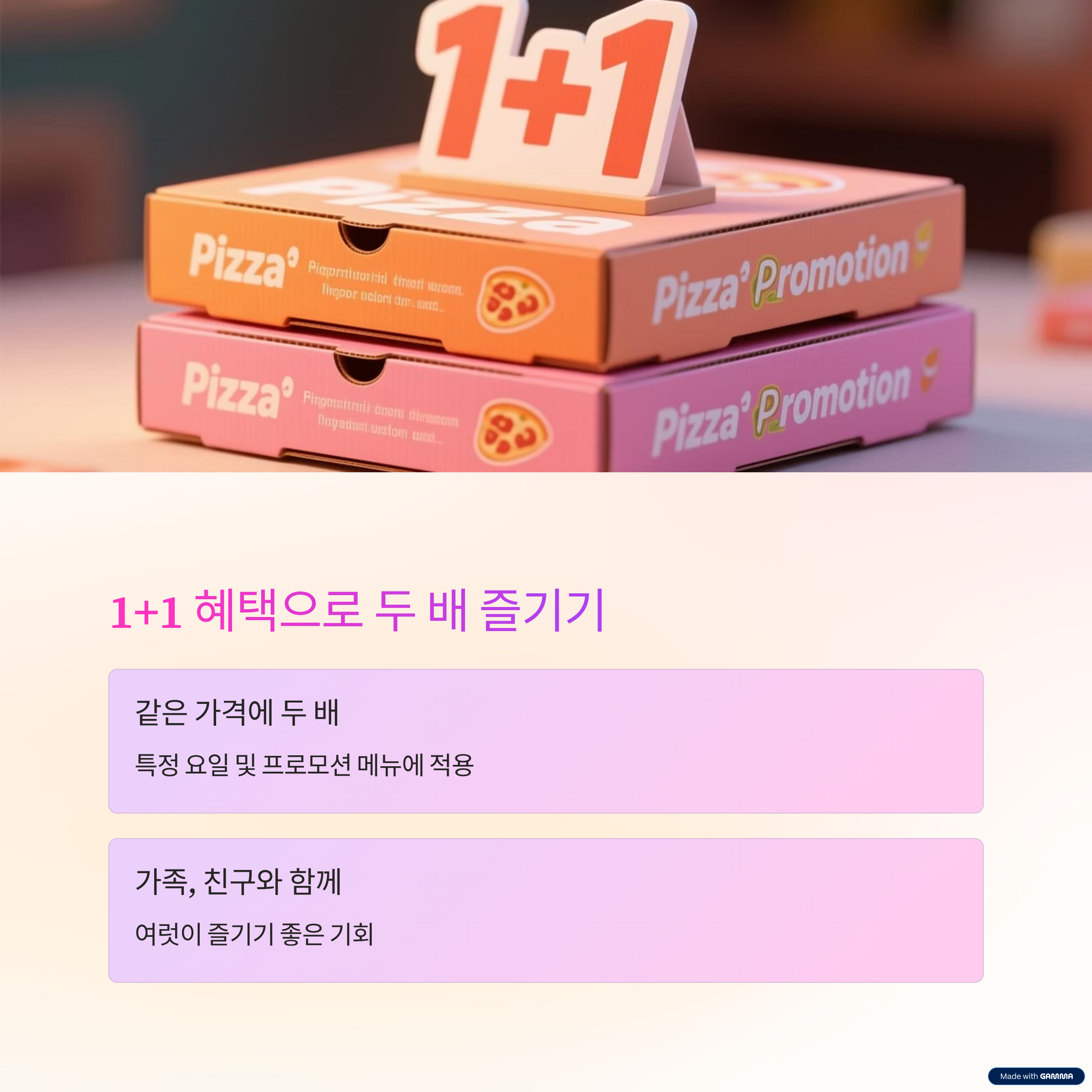 특정 요일이나 프로모션 메뉴에는 1+1 혜택도 적용됩니다. 같은 가격에 두 판을 받아볼 수 있으니 가족이나 친구들과 함께라면 최고의 선택이 됩니다. 할인과 1+1을 함께 활용하면 피자 원정대 느낌이 납니다.